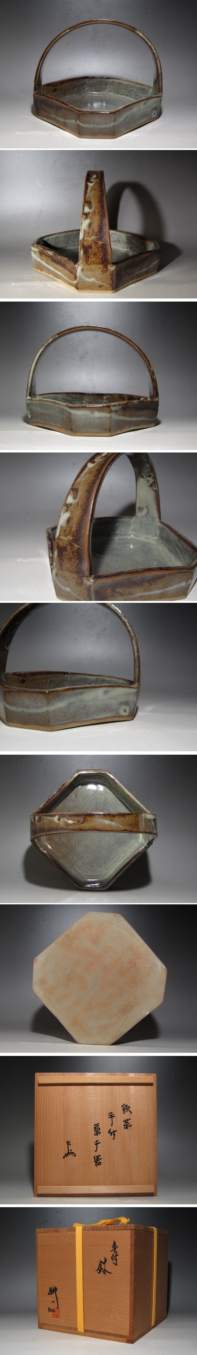 人間国宝田村耕一作の鉄薬手付鉢です。 味わいある景色の素晴らしい作品です。 箱蓋裏に表千家十三代即中斎の花押があります。 【田村耕一(たむら こういち)1918-1987】 昭和時代の陶芸家。富本憲吉に師事。 昭和28年郷里の栃木県佐野に築窯,日本伝統工芸展などで活躍した。 鉄絵の技法を基本にして独自の作風を築き,イスタンブール国際陶芸展グランプリなど,国内外での受賞多数。 51年母校東京芸大の教授。61年鉄絵で人間国宝。 サイズ 直径20.5cm/高さ15.5cm(多少の誤差はお許しください) 状態 一見して疵やヒビ・直しは見られません。 骨董品という事をご勘案頂き、時代経過のスレや、小さな傷がある場合があるかもしれませんのでご承知置きください。 | |||