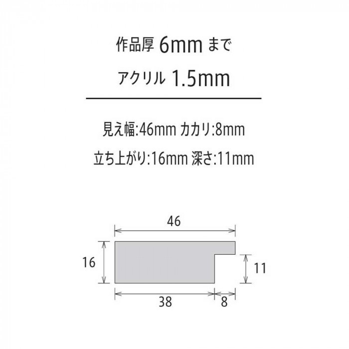 | 仕様 | 見え幅:46mm、カカリ:8mm、立ち上がり:16mm、深さ:11mm、作品厚 6mmまで、アクリル 1.5mm 【収納可能な作品サイズ】200角 200x200mm |