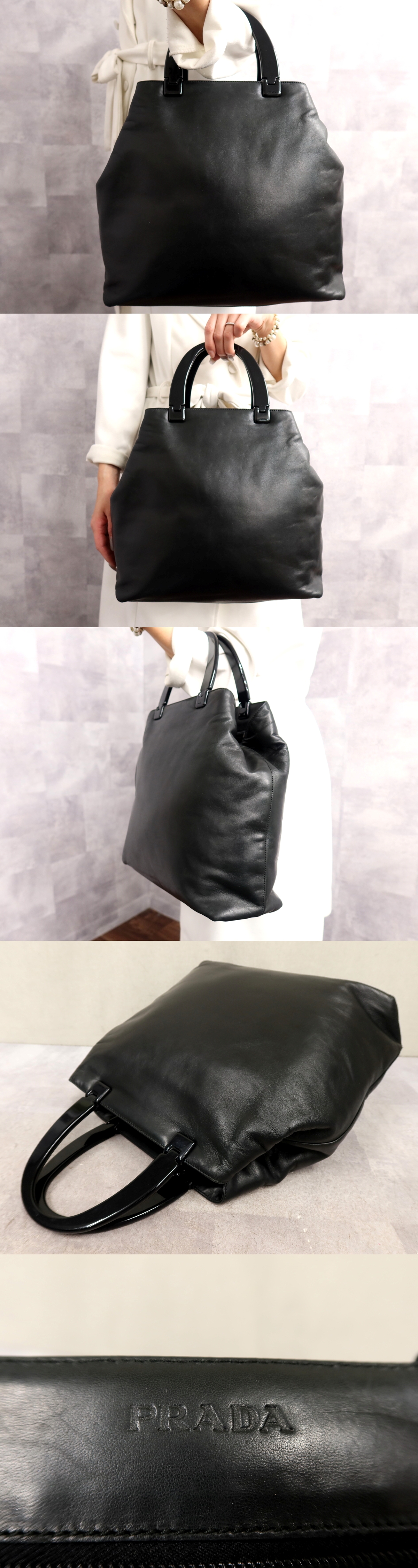 ●超美品●PRADA プラダ●ロゴ型押し●プラスチックハンドル●カーフ レザー 本革●ハンド バッグ●黒●イタリア製●腕掛け●A4●Js64922 收藏