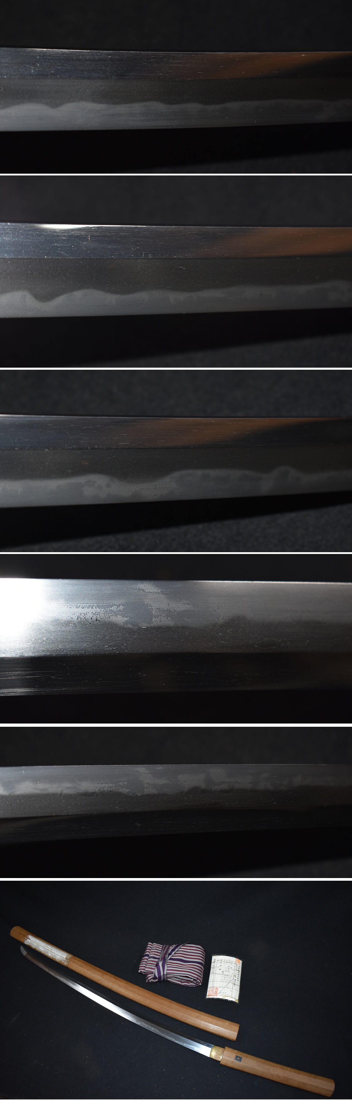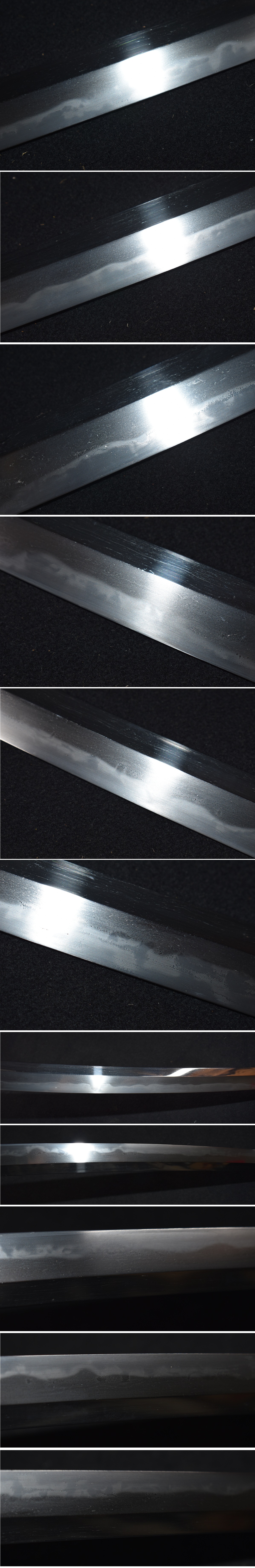 ご覧いただきありがとうございます。今回出品する品物は、写真の刀です。 銃砲刀剣類登録証番号 大分県 第28772号 種別 刀 長さ 67.9センチ 反り 1.9センチ 目くぎ穴 1個 元幅約3.3センチ 元重約0.7センチ 先幅約2.2センチ 刀身だけの重量約786グラム 在銘 無銘 初出しの御刀です。江戸後期(新々刀)の刀で、初茎の鎬造りです。白鞘には、紙が貼った跡が あります。 新々刀の備前丁子の乱れ刃紋で、固山宗次や長運斎綱俊のような刃紋です。まさに幕末(江戸後期) の豪傑・備前伝の御刀です。 状態は、錆や刃こぼれやハギレはありません。綺麗な刀身です。焼き刃には、飛び焼きや湯走りが 入り、見どころある名刀です。 出来が、全然違う格上の刀工が作った御刀だと思います。是非、コレクションにいいと思います。 初代長運斎綱俊は綱俊は和泉守國秀の三男で、山形藩工で濤瀾刃の名手であった加藤綱英の弟。 寛政十年(1798)生まれ。本国出羽、米沢藩上杉家の抱工という。 加藤八郎と称し、是俊とも銘した。水心子正秀に学び、長運斎と号す。江戸に移住しさらに大阪 に上がり、鈴木治國に師事したのち、西国を遊歴、熊本に駐槌。安政三年(1856)には長運斎を 息子の是俊、二代綱俊に譲り、銘を長寿斎と改める。 文政六年(1823)頃より江戸麻布の上杉家中家敷に住み、文久三年(1863)十二月六十六歳で没 した。甥に七代石堂是一、弟子に固山宗次、高橋長信、青竜軒盛俊など優れた門人がおり、幕末 の江戸で一大流派を築いた。殊に備前伝では水心子一門を凌ぐ勢いであったと言う。 長運斎綱俊の刃紋は固山宗次の良くにた作品です。一般的に固山宗次の切先刃文は乱れ込む作品 が多く綱俊は丸く返る作品となります。 出来の良い作品ですので是非よろしくお願いいたします。 後は写真と画像を見て判断下さい質問はわかる範囲でお答えしますので、入札前にお願いします。 発送はゆうパックの着払いです。 ※注意事項※落札しましたら、登録のある教育委員会に名義変更届を出してください。 よろしくお願いします。 |