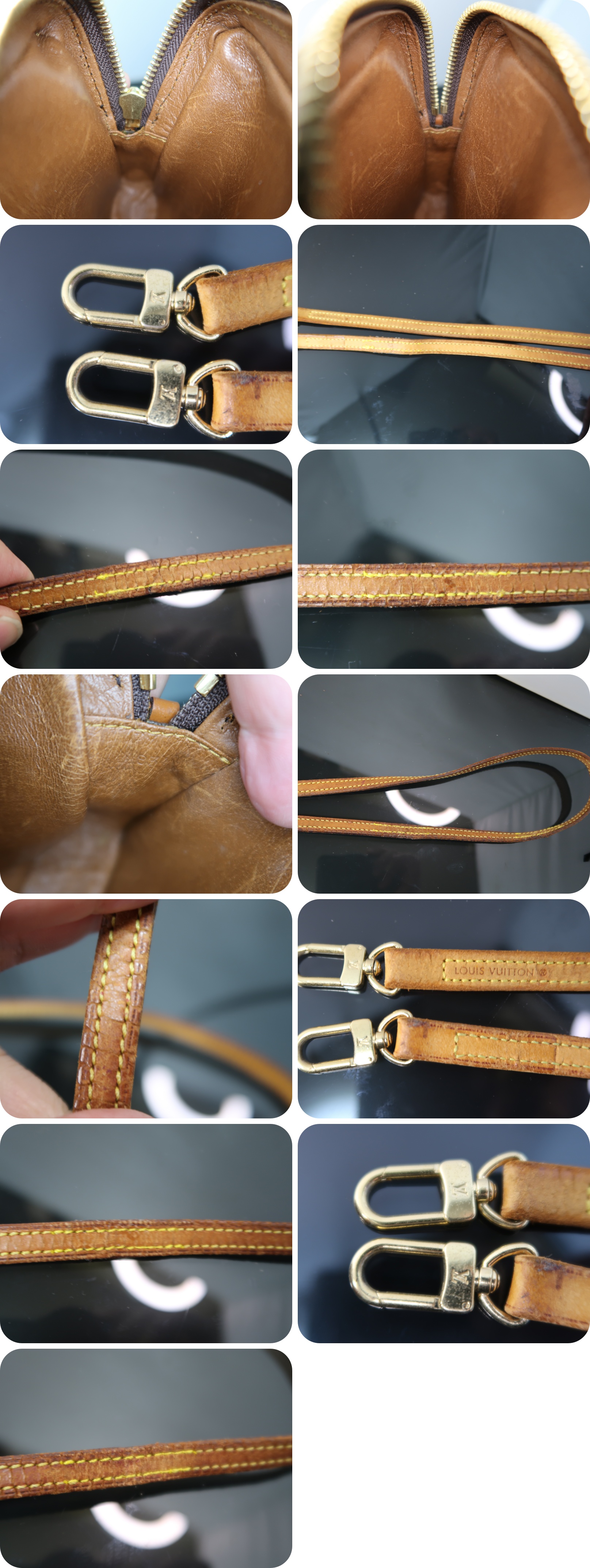 | <外側> | ポーチのファスナーを私が交換しております。引手は純正です。 ショルダーベルトのヌメ革に使用感が強いです。所々、補修箇所があります。ひび割れ、欠けが見られます。 |