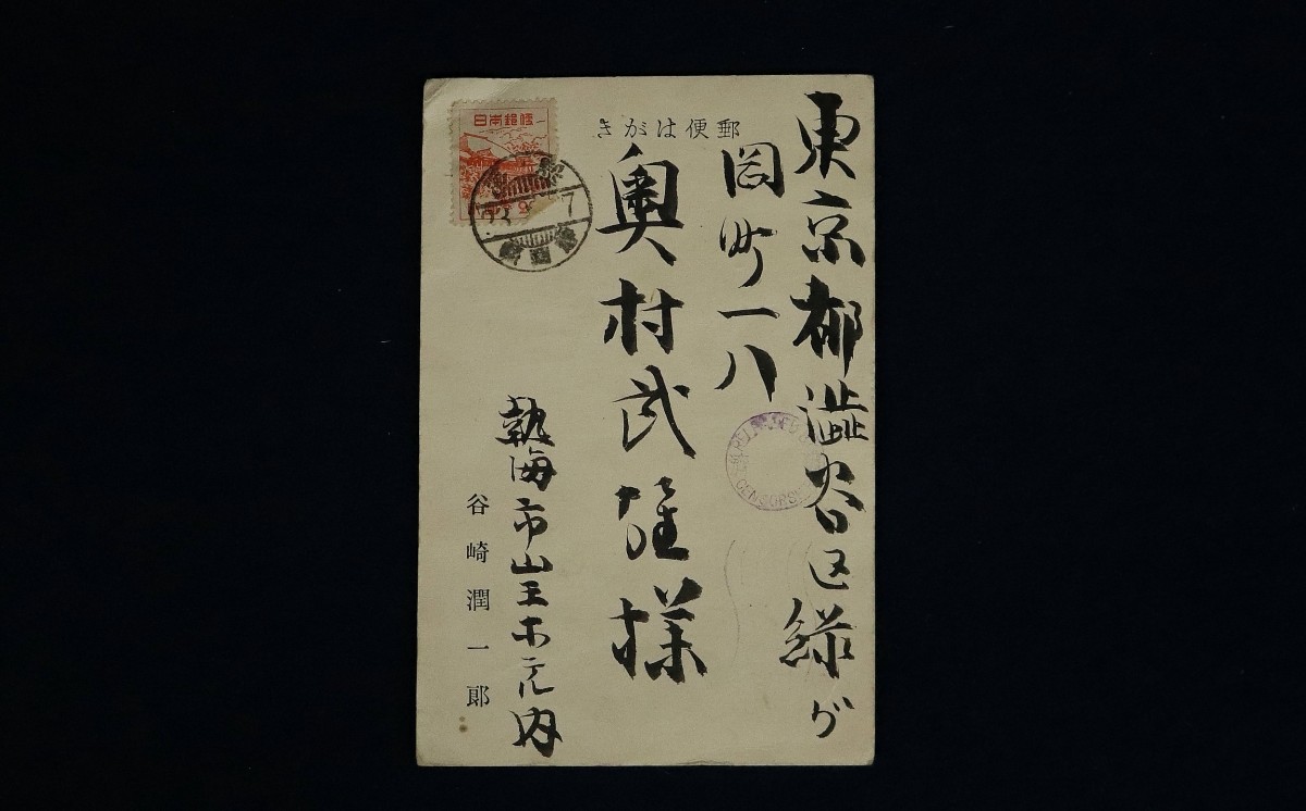 12710■【真作】谷崎潤一郎 直筆葉書 昭和23年消印 奥村武雄宛 小説家 耽美派 文豪 痴人の愛 收藏