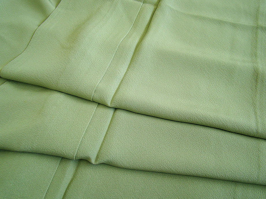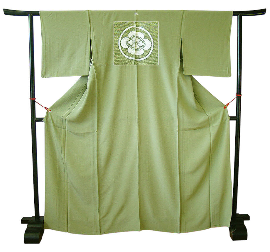 時代屋 裄66.3cm 単衣 お茶事 極上縮緬地 柳色 色無地 正絹 仕立上り 丸に横木瓜 154cm~160cm M1085 收藏