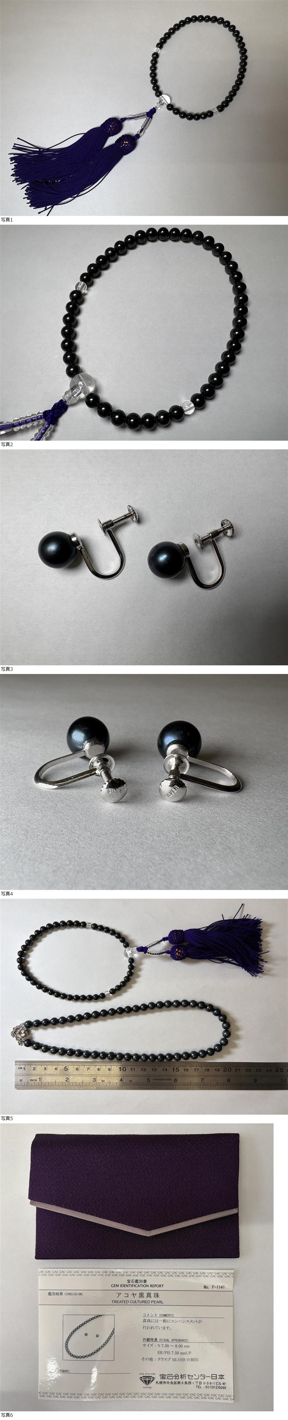 | アコヤ黒真珠/パールネックレス/7.5~8㎜/金具/SILVER/鑑別書付/イヤリング/数珠/おまとめ/3点セット/装飾品/アクセサリー |