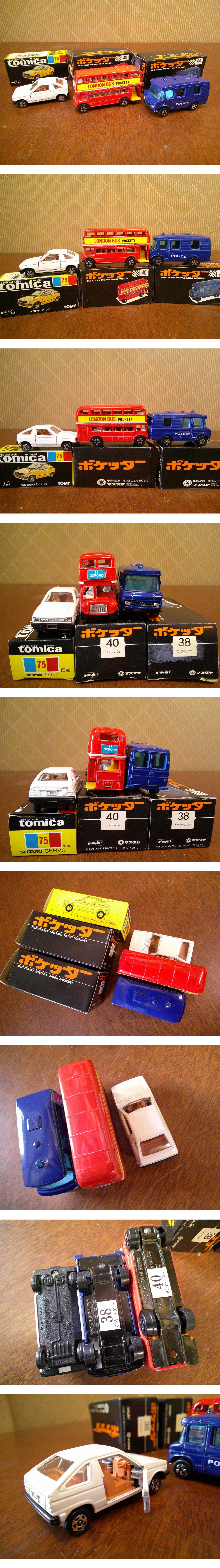 ミニカー 66 / tomica 黒箱 No.75 スズキ セルボ, ポケッター No.40 ロンドンバス No.38 ベンツポリスカー まとめて3点set レア 当時物 收藏