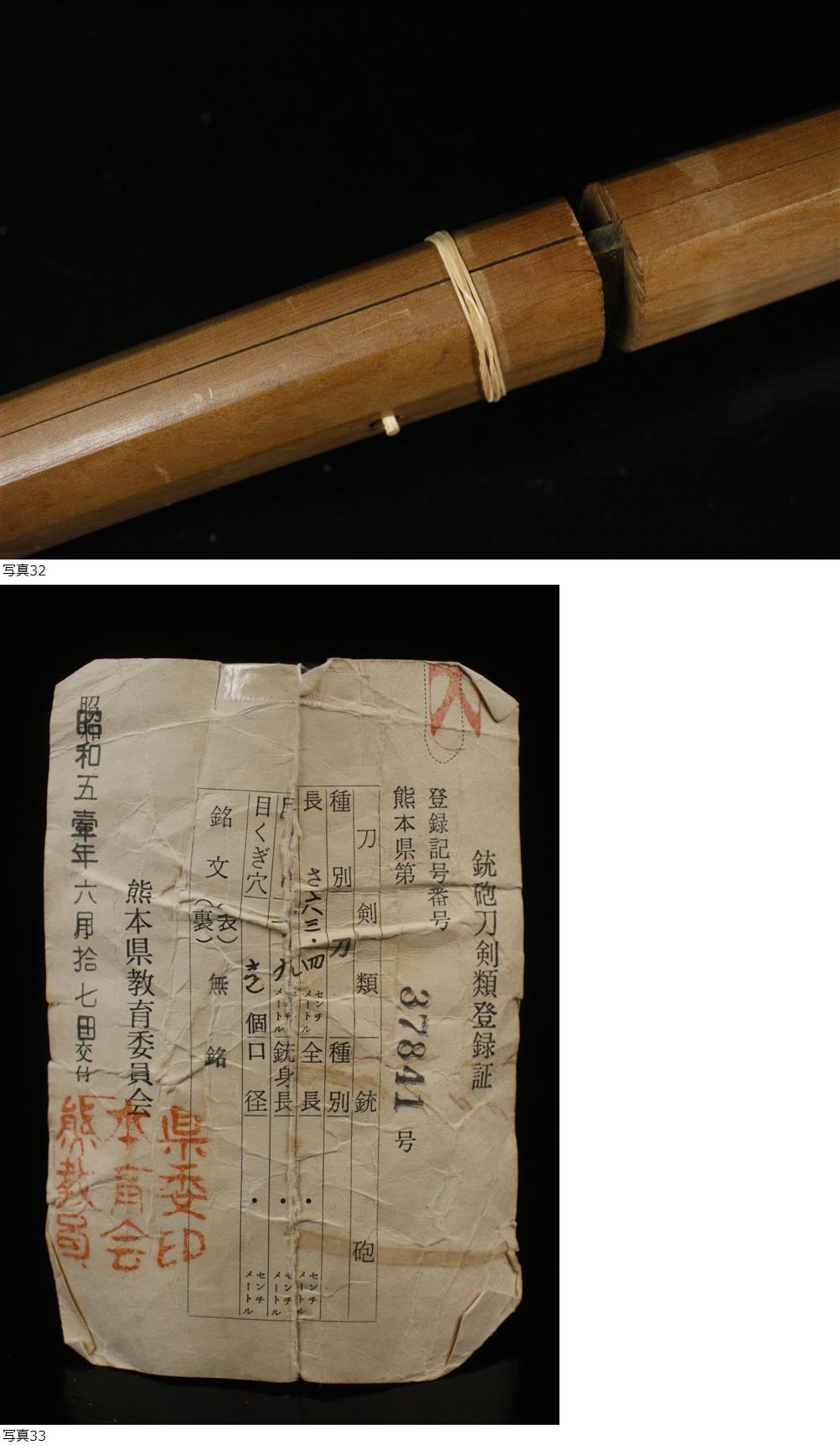 26020601* * * 商品詳細 * * * ここでしか出逢うことのできない唯一の美をご紹介させて頂きます。 身幅広く迫力ある姿をした一振です。 程よい反りで体配も良く、安定感がありながらも優雅な佇まいが魅力的です。 日本刀ならではの力強さと気迫に満ち溢れた豪壮刀の名が似合う逸品です。 この機会に是非お求めください。 ■商品内容/刀本体、白鞘、登録証。 ■本身サイズ 全長/82.7㎝ 刃渡/63.4㎝ 元幅/3.3㎝ 先幅/2.1㎝ 元重/0.8㎝ 先重/0.5㎝ 本身重量/749g ■状態/キズ、サビ、切先に少しの潰れ、ハバキ下に極小さな刃毀れ、 白鞘にスレ、キズ、シミ、浮き、直し、テープ補正等傷みがございます。 ハギレはありません。鞘と柄の間に隙間が出来ます。 登録証に破れ、テープ補正がございます。 ※写真にてご確認、ご了承の上ご入札ください。 ご落札(購入)後は所定の期日までに都道府県の教育委員会に所有者変更の届出をお願い致します。 * * * 支払詳細 * * * !かんたん決済 * * * 発送詳細 * * * 入金確認後3営業日以内に発送致します。 ※直接引き取りも可能です。 60~160サイズにつきましては 佐川急便、ゆうパックのどちらかで発送いたします。 ゆうパック発送の場合、弊社の発送日から追跡サービスに問合せ番号が反映されるまで 約1日ほどお時間がかかりますのでご了承下さい。 * * * 注意事項 * * * 運送中の破損があった場合は速やかに当社までご連絡下さい。 保険を利用するのに受取連絡後に運送会社による現場での破損状況確認が必要となります。 勝手に返送されますと保険の適用外となりますのでご注意ください。 * * * * * * お問い合わせ:082-236-8669 |