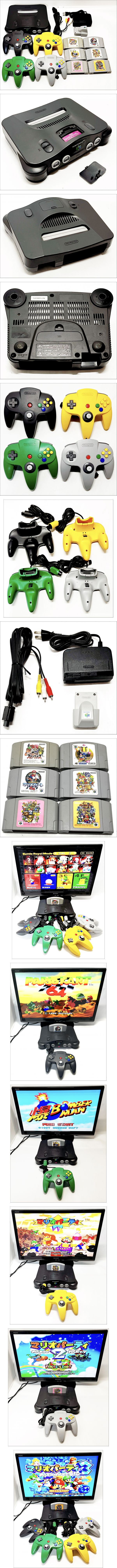 | 【動作確認済み】 NINTENDO 64 NUS-001 ブラック 本体 ACアダプター 純正AVケーブル コントローラー4個 ソフト6本等 セット N64 任天堂 | ||