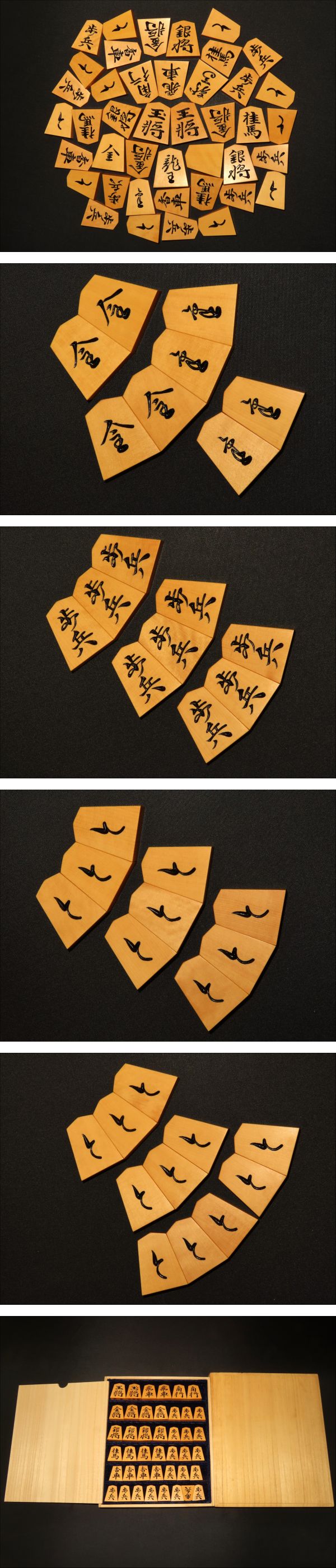 木地は御蔵島黄楊糸柾。ご覧のとおり非常に味の良い木地です。全ての駒の表裏をUP致しましたので是非ご覧下さいませ。