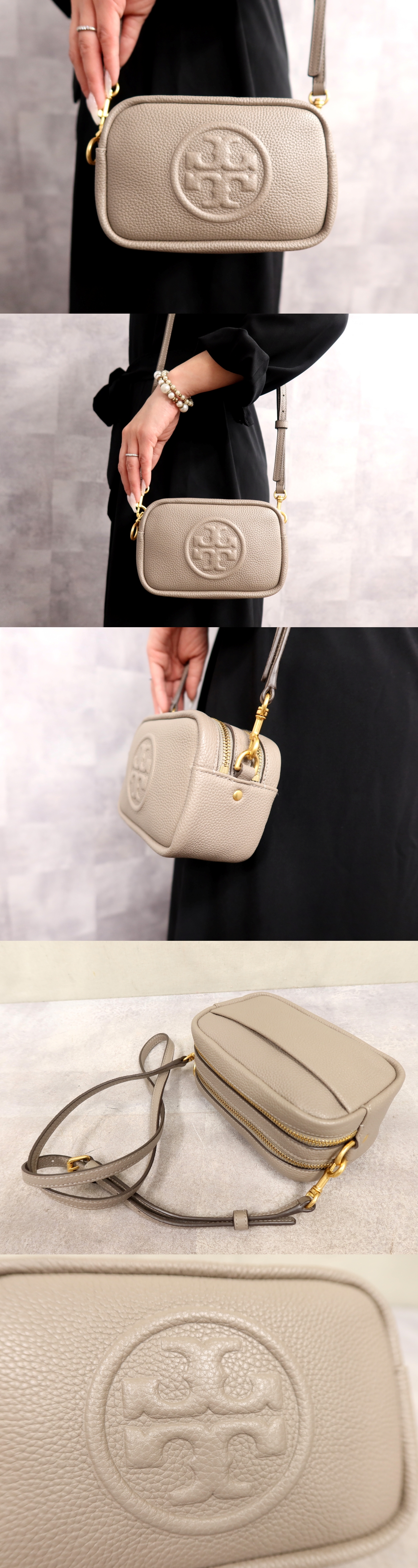 超美品●TORY BURCH トリーバーチ●ペリー ボンベ ミニ バッグ●カーフ レザー 本革●ショルダー バッグ●グレー系●ゴールド金具●Js67076 收藏