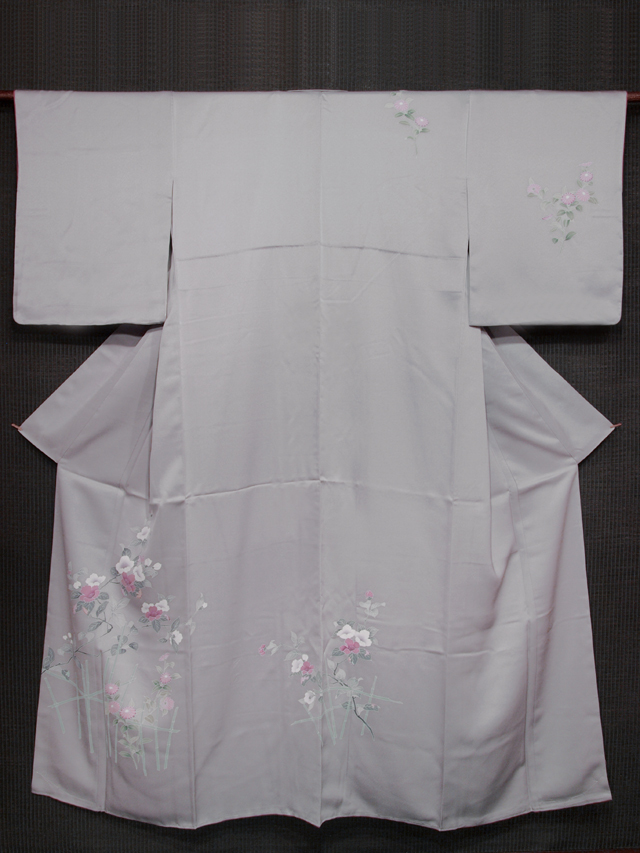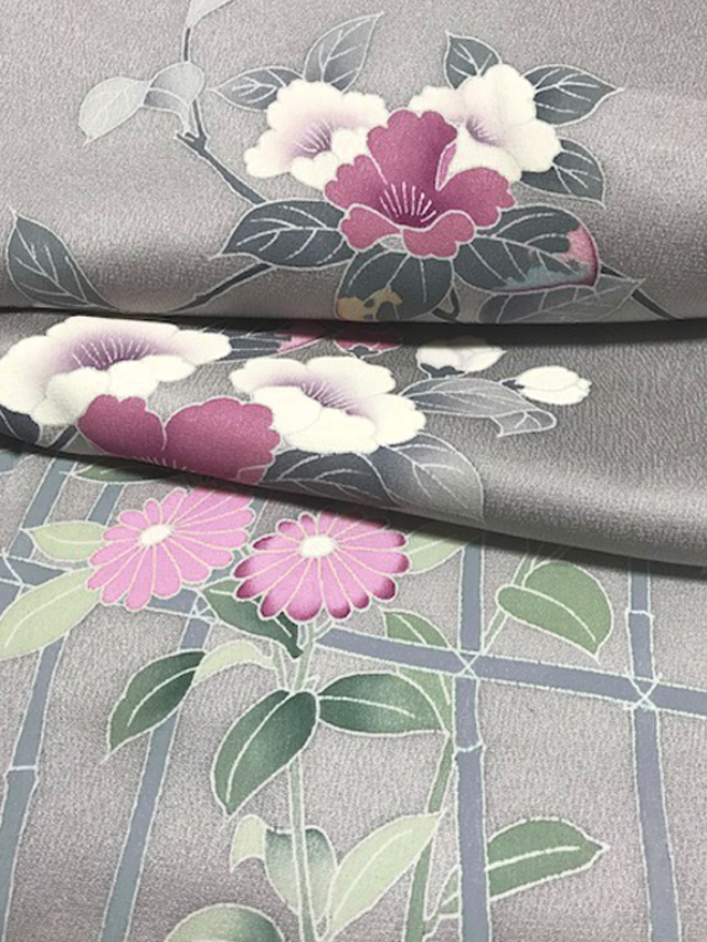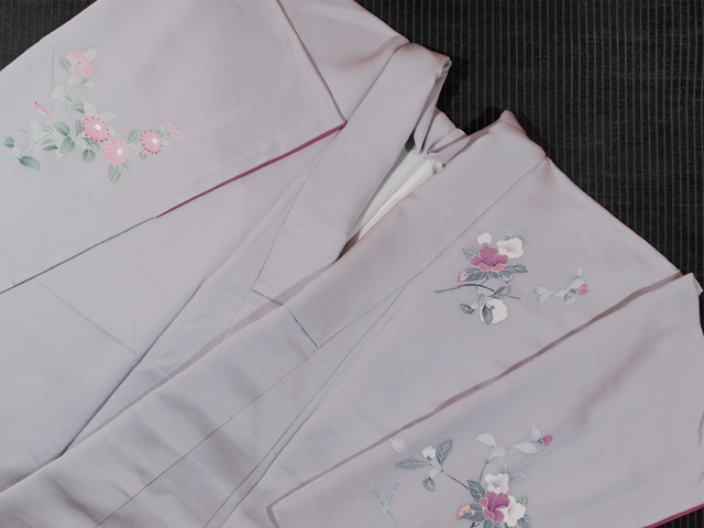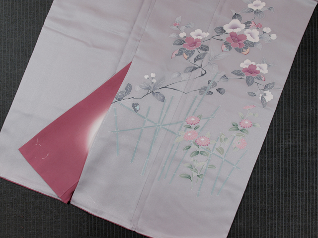 濃いめの紫水晶色の地に、こまかな地紋が織り出され、山茶花(さざんか)と菊の配された垣根の文様が友禅染めされている、綸子縮緬の付下げ訪問着です。袷仕立てです。 シックな地色がさびの風情を醸しつつも、艶やかさのある花の色がしっとりとした趣きで、気品のある美しさを感じさせます。なめらかでやわらかな手ざわりの重めの綸子地です。 しつけ付きの仕立て上がり未使用保管品で、しみやよごれ、褪色などのダメージもありません。新品同様にきれいです。 |