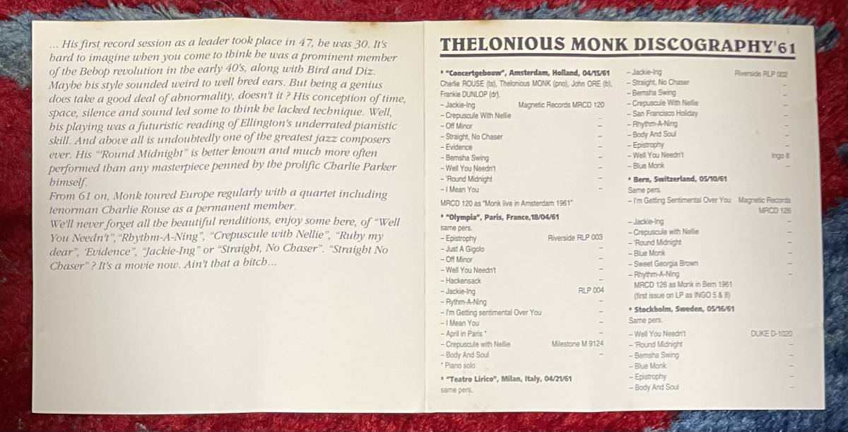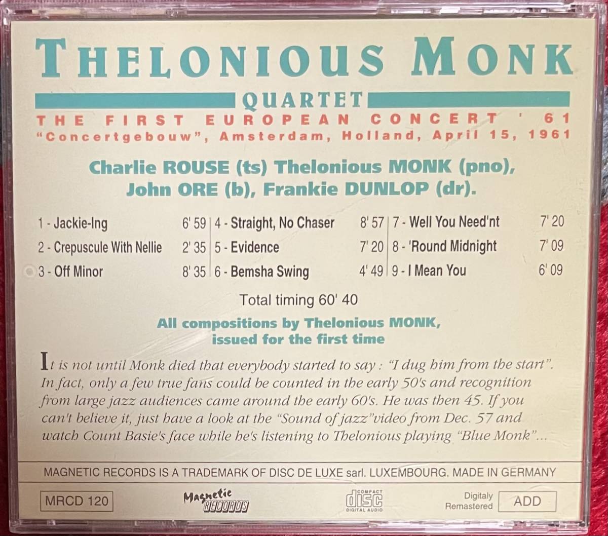 【中古JAZZ CD】THELONIOUS MONK QUARTET / THE FIRST EUROPEAN CONCERT ’61 セロニアスモンクカルテット 收藏