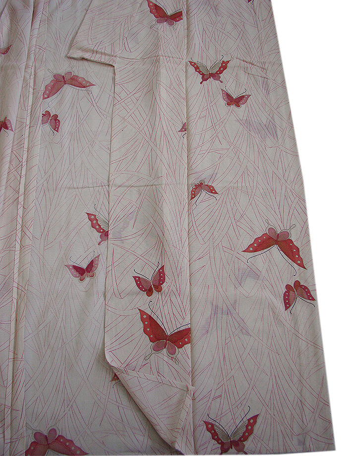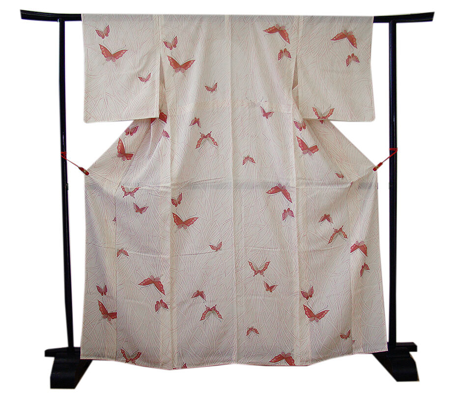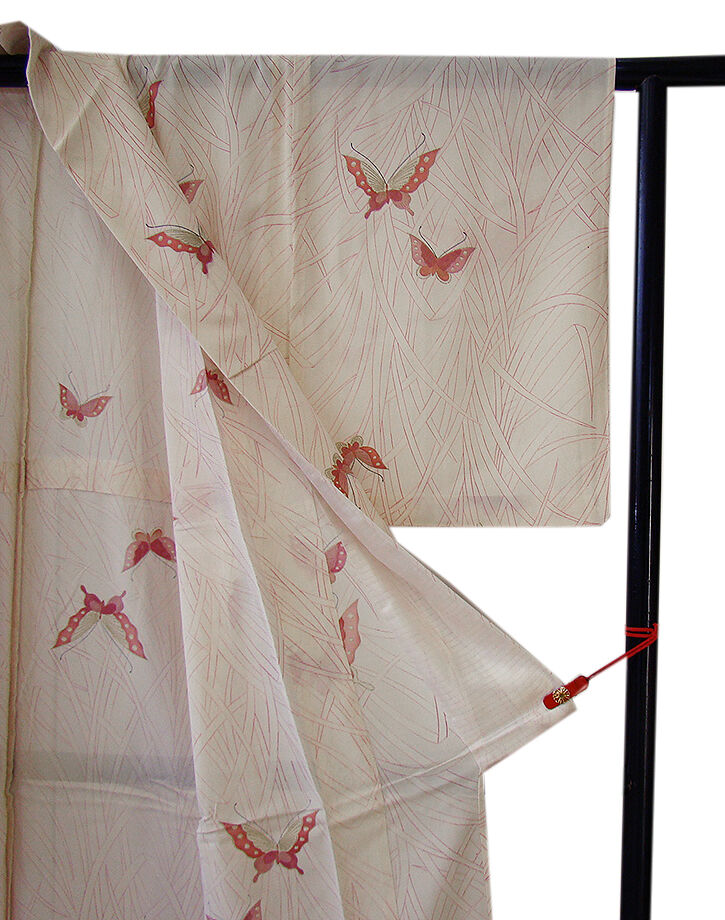 | 商品説明 | こちらのお品は夏物でございますので、7月~8月にお召頂ければと思います。 絽と言えば、紗と双璧を成す夏のお着物の生地で、 その最大の魅力は絶妙の透かし加減でございます。 清涼感溢れるしなやかさは、夏に着物を着るという贅沢を快適に愉しませてくれる事でしょう。 着物には、大きく分けて「袷(あわせ)の着物」と「単衣(ひとえ)の着物」と「夏着物」があります。 反物(表地)を着物に仕立てるときに、裏地類をつけるものを袷の着物、 つけないものを単衣の着物と呼び、胴裏や八掛といった裏地がつかない一枚ものの着物です。 また裏地がないため、座る時などにヒップのラインが目立たないよう、 居敷当て(いしきあて)の生地をつけることもあります。 居敷当ては付いておりません。 大変にしなやかなさらっとした肌触りが極上の着心地を誘う滑らかな「五泉」の駒絽の生地は オフホワイト色地に浅紫色の草木、蝶柄の染柄に金彩加工仕立てとなっております。 |