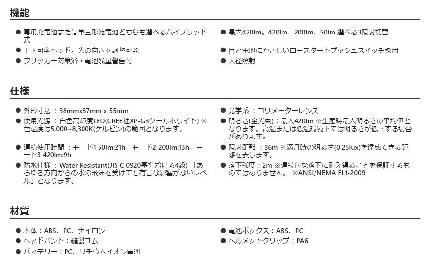・連続使用時間 :モード1 50lm:21h、モード2 200lm:13h、モード3 420lm:9h