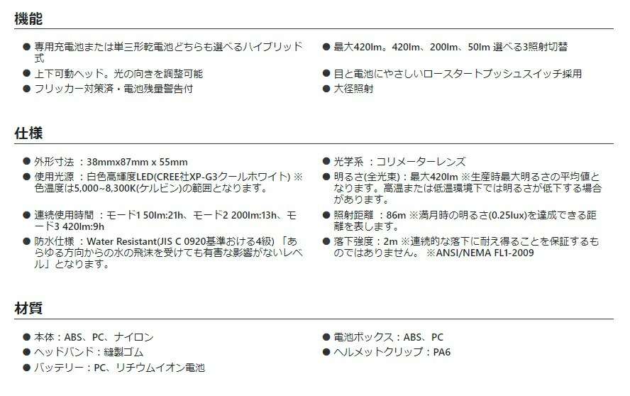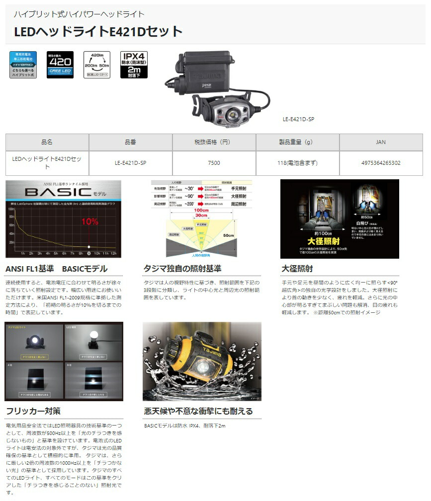 タジマ TAJIMALEDヘッドライトE421Dセット商品コードLE-E421D-SP製品情報製品重量:118g(電池含まず)■機能●専用充電池または単三形乾電池どちらも選べるハイブリッド式●最大420lm。420lm、200lm、50lm 選べる3照射切替●上下可動ヘッド。光の向きを調整可能●目と電池にやさしいロースタートプッシュスイッチ採用●フリッカー対策済・電池残量警告付●大径照射