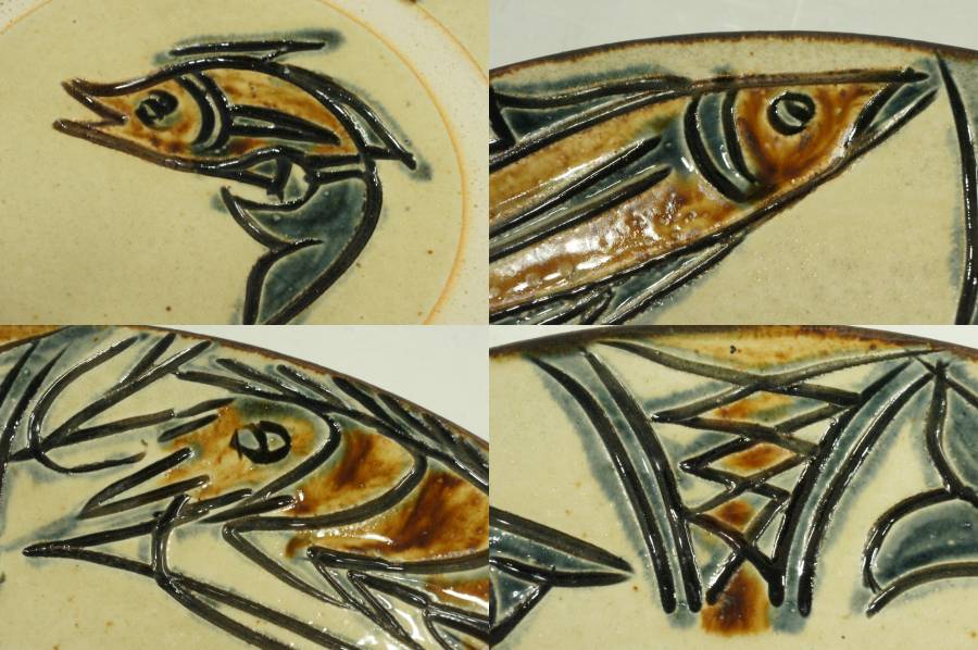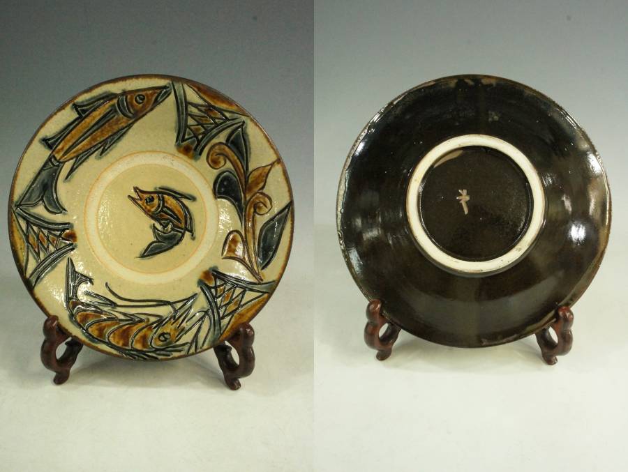 ●壺屋焼 人間国宝 金城次郎 海老魚文皿 大皿 共箱 未使用