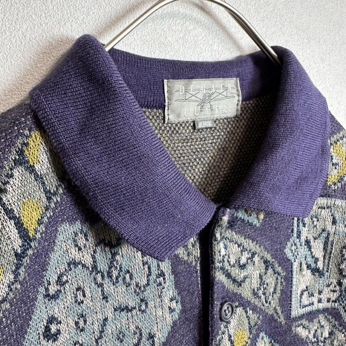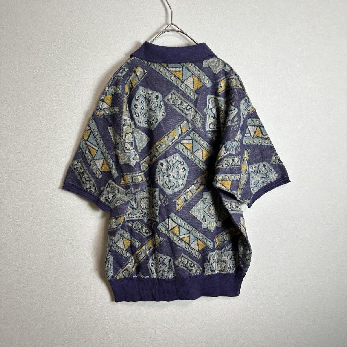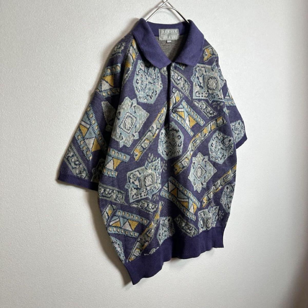 サマーニット半袖セーター リネン混 麻 総柄 希少デザイン パープル 紫 Mサイズ ポロシャツ 收藏