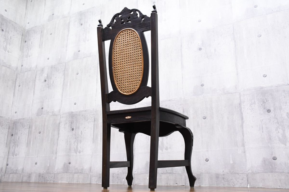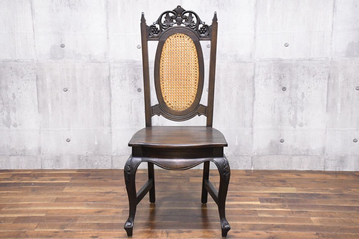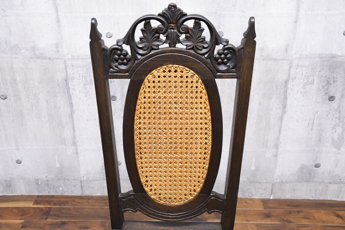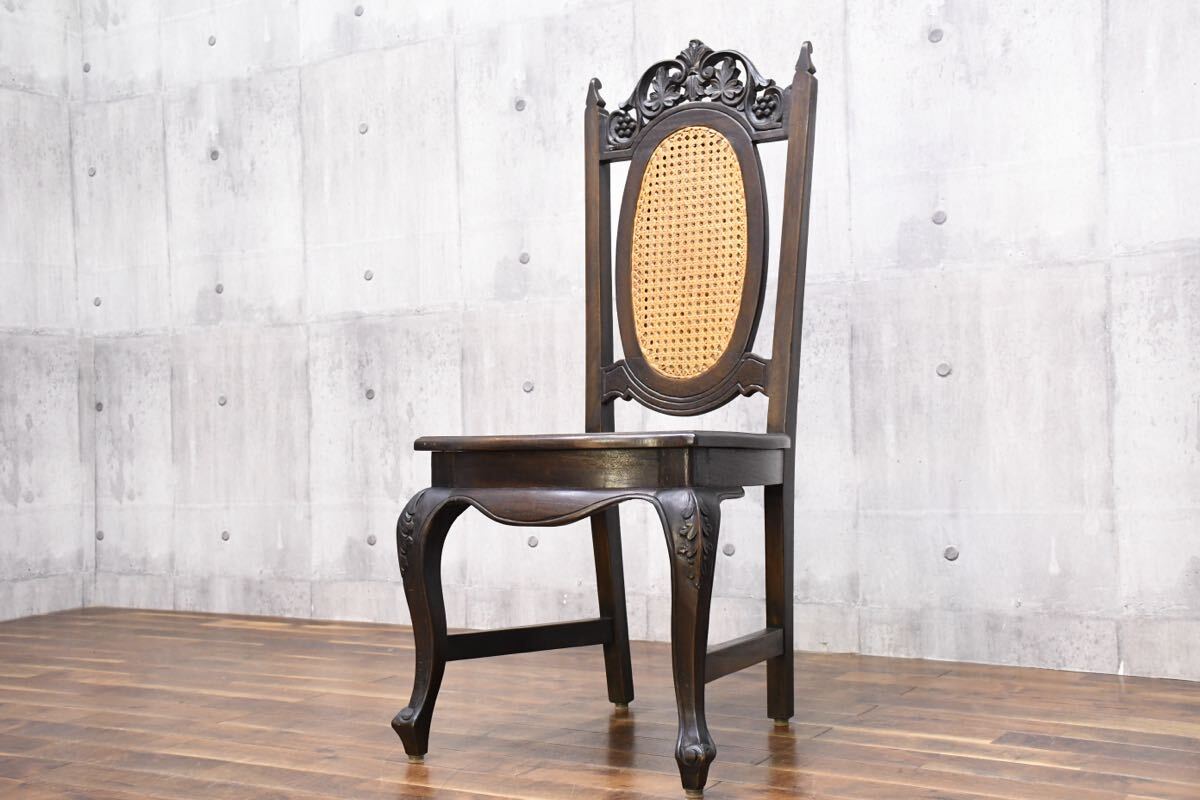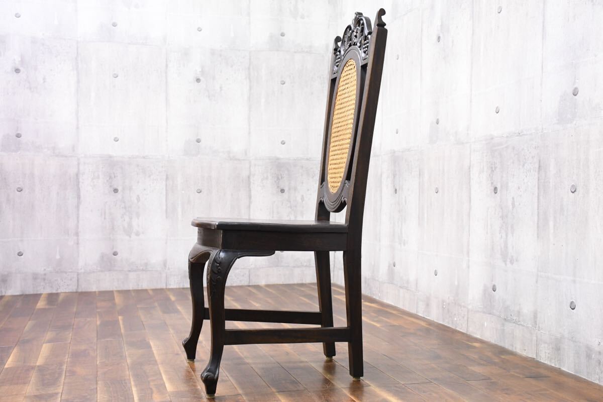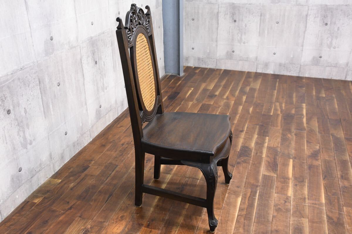 素晴らしい作りで、細かなレリーフや二重になったラタン編み込みの背もたれなど、職人の技術とセンスが光る逸品です。