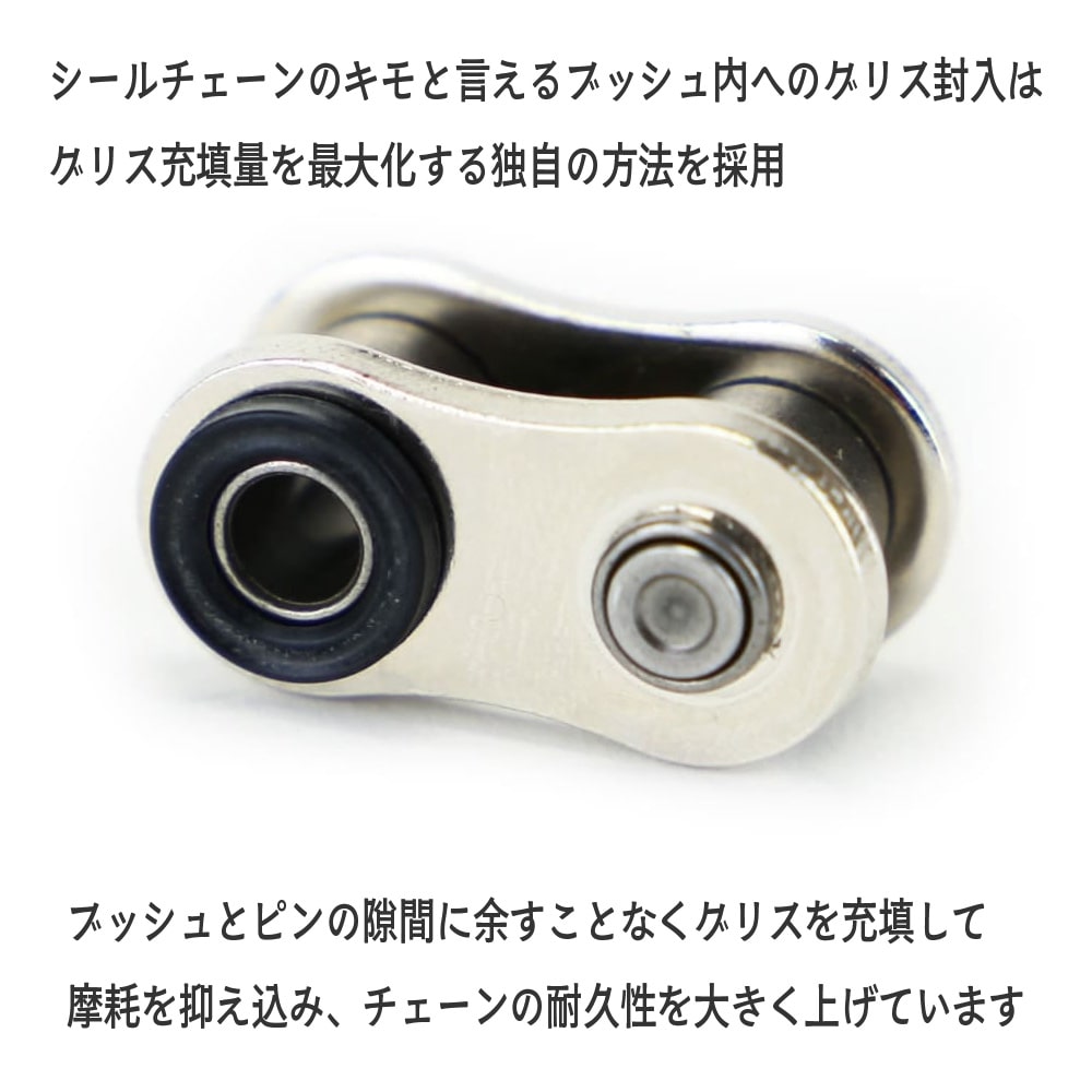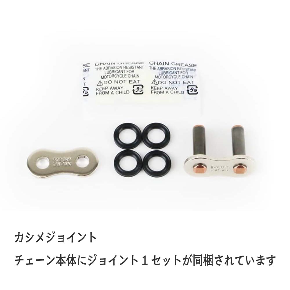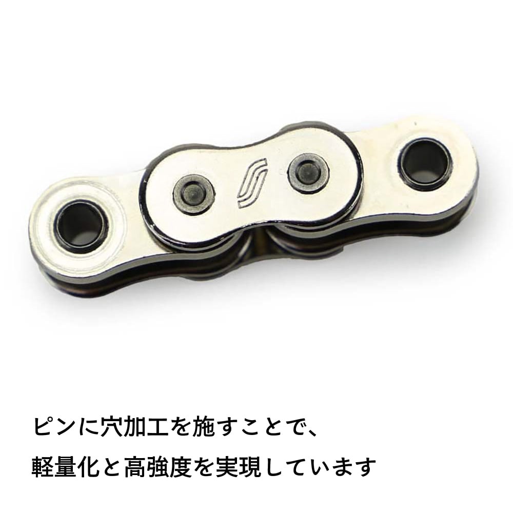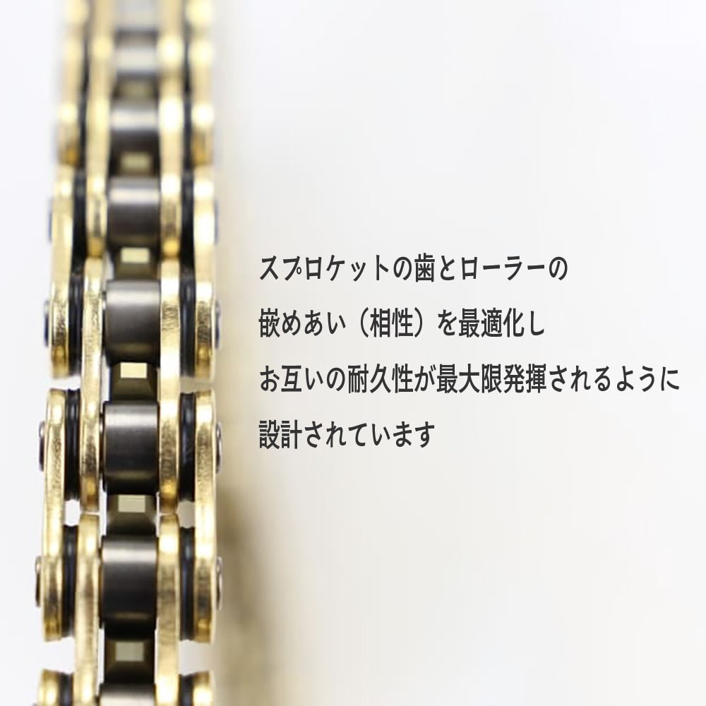 ※こちらは大型車用の520サイズのチェーンです。 華やかさと高性能を兼ね備えたゴールドチェーン 明るく輝くゴールドメッキを施したモーターサイクル専用チェーン。 シャンパンゴールドのアルミスプロケットと組み合わせることで、足元を華やかに演出します。 サンスターの技術が生んだ高耐久チェーン 半世紀以上にわたりスプロケットを生産してきたサンスターが、スプロケットとの組み合わせを徹底追及して開発。 サンスター前後スプロケットとの併用で、互いの耐久性を最大限に発揮。 純正や他社製スプロケットとの組み合わせでも問題なし。 スプロケット歯とローラーの嵌めあいを最適化し、摩耗を抑制。 さらに、ピンへの穴加工により軽量化と高強度を両立。 シールチェーンの要となるブッシュ内へのグリス封入には独自方式を採用し、隙間なくグリスを充填することで耐久性を大幅に向上させています。 コストパフォーマンスにも優れた設計 気軽にチェーン交換ができるよう、リーズナブルな価格を実現。 耐久性と性能を兼ね備えながらコストも抑えた、バランスの良いチェーンです。 |