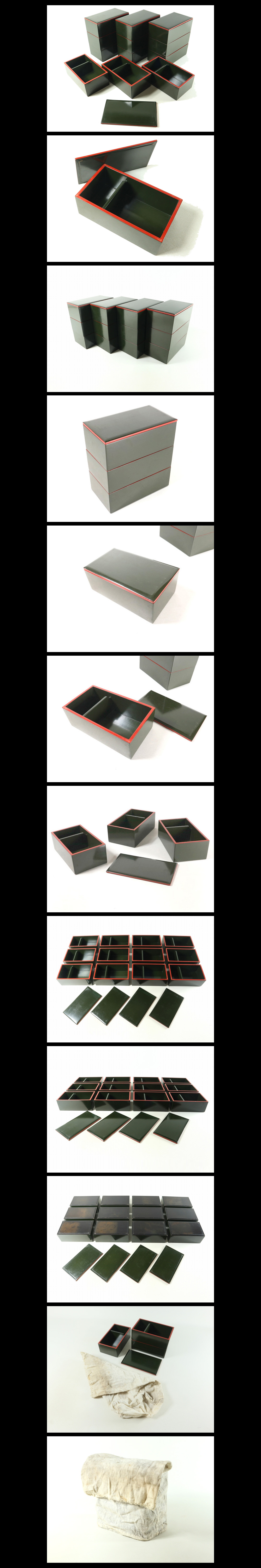 ●c078●【御弁当箱12個(三段重×4set)天然木 青地朱縁 布着下地】検お茶会煎茶道具茶懐石重箱辨當箱内側深め弁当箱●西瓜●