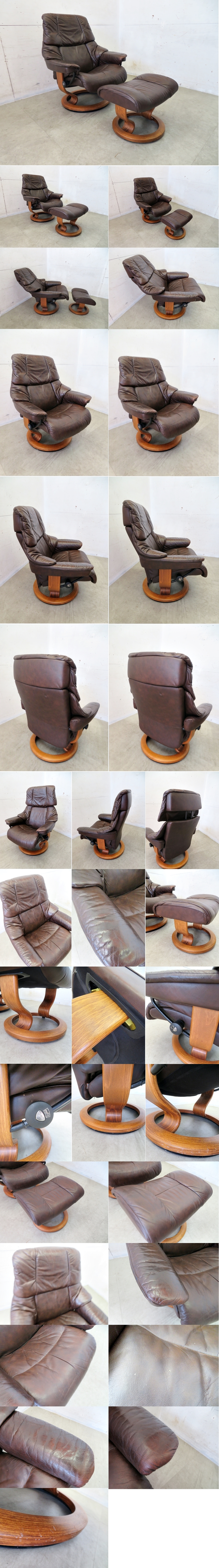 スカンジナビア地域最大の家具メーカー【エコーネス(EKORNES)】から、最新のテクノロジーと家具職人の技術の粋を結合した結果生まれた、 世界35カ国で広く親しまれているストレスレスチェア【レノ(M)】をご紹介します。 【エコーネス】のストレスレスチェアは、ノルウェー西部の工場で、十分な生産管理のもと作られており、高品質で耐久性の高い製品として信頼されています。 今回ご紹介するストレスレスチェアは、肩の負担を軽減し頭を優しく支えてくれるハイバックの背もたれに、 どんなポジションでも全身を快適にサポートしてくれるリクライニング機能を搭載。 背座はもちろん、アームにまで贅沢に上質な本革を配した、高級総革仕様となっています。 円形の脚部は360度回転して、動きは自由自在。体の動きに応じた最適なポジションでリラックスする事ができます。 クッションはシックなブラウンの本革、アームと脚部はヨーロッパ産のブナ材の積層合板を使用していて、 こちらも落ち着いた雰囲気のベージュカラーなので、モダンなインテリアにも最適です。 さらにオットマンもセットになっており、大変使い勝手の良い一品です。 リビングや寝室に置くと、テレビを観たり読書をするリラックスタイムに手放せないアイテムとなりそうですし、 SOHOやオフィスでも、仕事の合間にゆったりとくつろいでいただけます。 まるで空に浮かんでいるかのような快適さを約束してくれる、【エコーネス】のストレスレスチェア。 この機会に是非お勧めします! 手触りやわらかな上質の本革を全面に使用した、高級総革使用/ノルウェー製です。 コンディション:中古のため写真のように使用感、傷、汚れ、アームに使用感はありますがその他は全体的に美品です。 サイズ横78センチ奥行き73-103センチ高さ100センチ座面高さ41センチです。 サイズ横55センチ奥行き40センチ高さ39センチです。