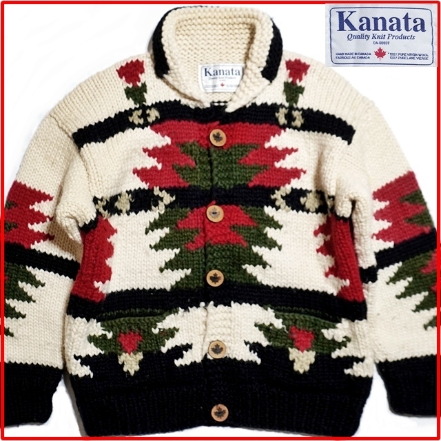 即決★カナダ製/Kanata★メンズXL位 カウチンセーター カナタ マルチカラー ウール カーディガン メープルボタン アウター 收藏