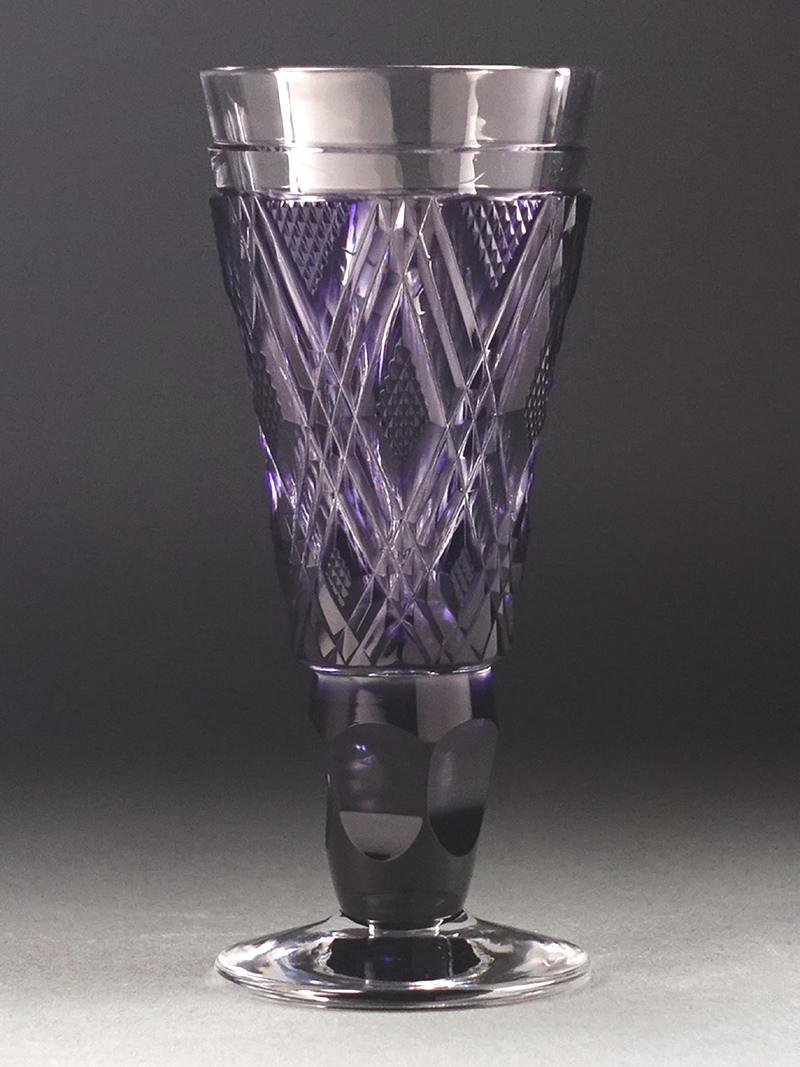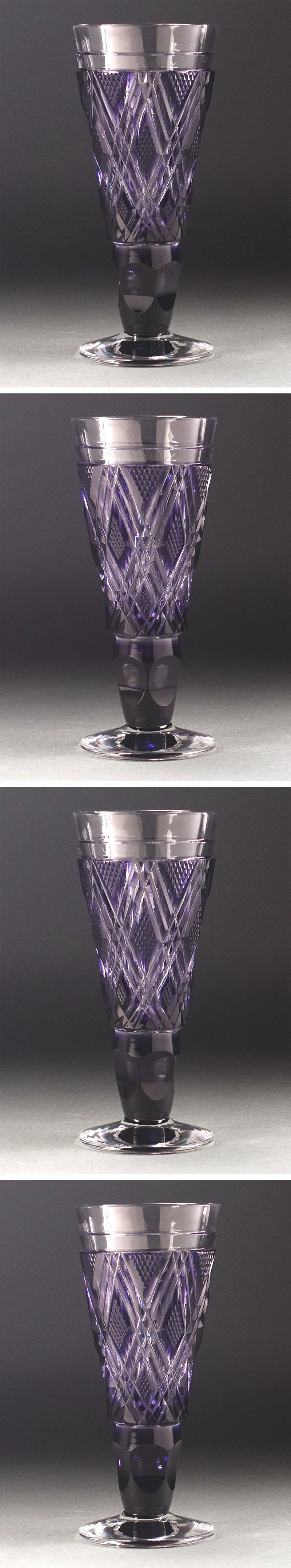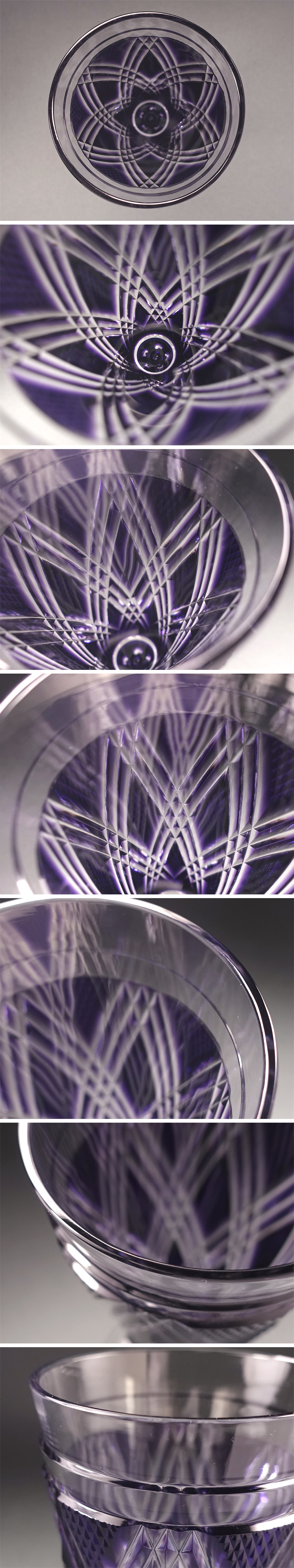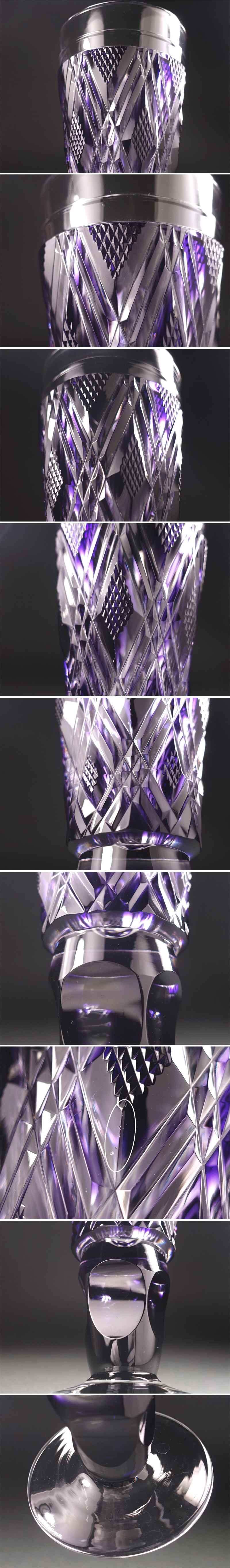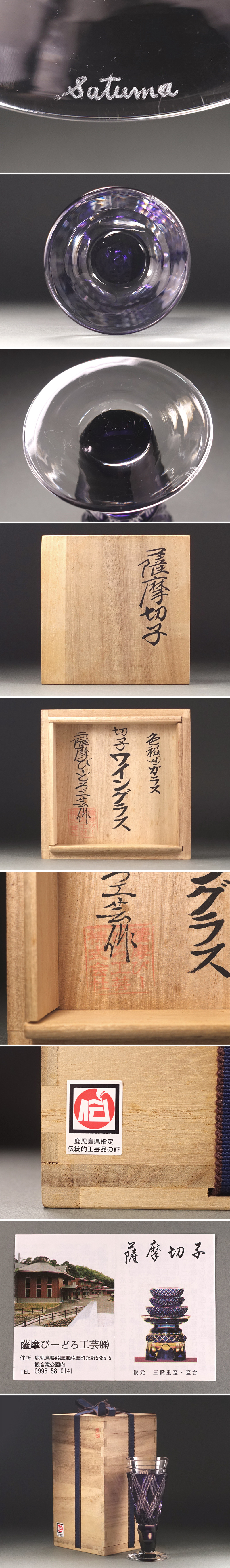 ∇花∇【薩摩びーどろ工芸】作 復元薩摩切子 紫被せ切子硝子ワイングラス 斜め三重格子に魚子文脚付杯 酒器 共箱付 收藏