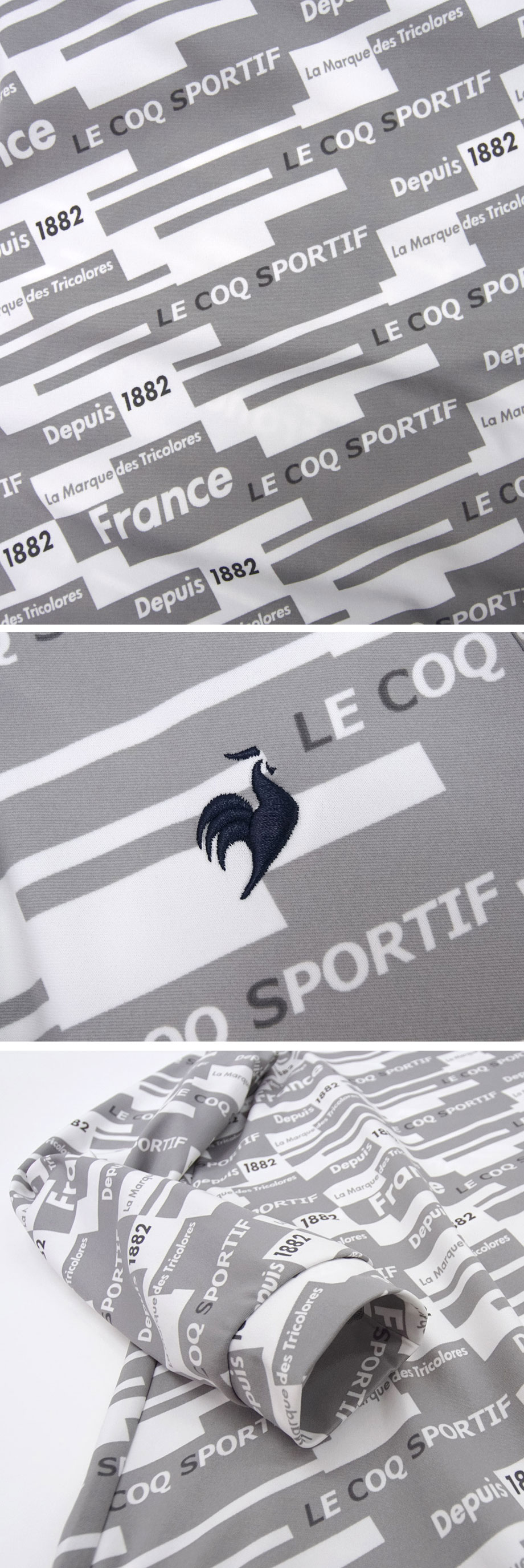 ●ブランド名などを大胆に配置した総柄が魅力。ゴルフウェアらしい気分もスコアも上がりそうな美しいデザイン。コントラストのはっきりとした色柄で華やかにロゴも引き立ちます。左肩にはお馴染みの雄鶏のロゴマーク刺繍、衿にもブランド名が鮮やかな刺繍で描かれています。