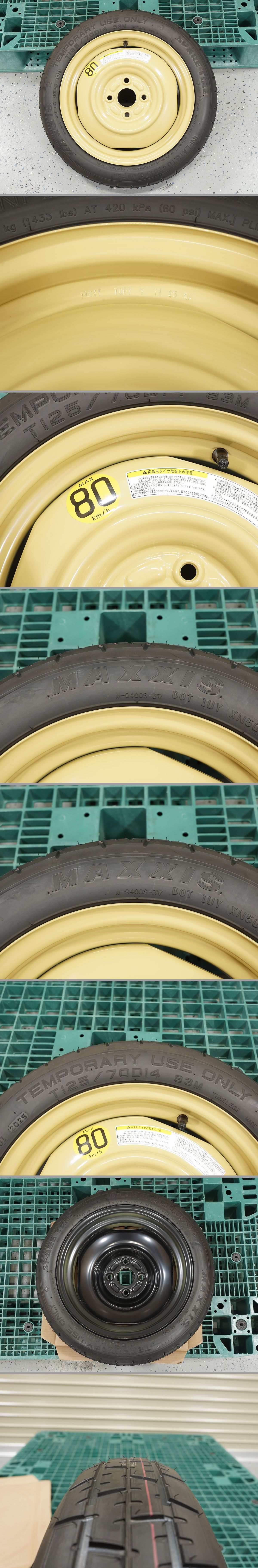【商 品】 スズキ エブリィ 純正 スペアタイヤ 納車前外し ホイール:14インチ×4T 100-4H ハブ径54mm タ イ ヤ:マキシス 125/70D14 製造年週:2025年20週 【商品状態】 ◎未使用!!納車前外し品!! ◎ナットホールに傷も無いので使用した形跡はありません!! ◎タイヤのヒゲ(スピュー)も残る未使用品!! ※ホイールに脱着時?保管時?に付いた小傷あり!! ◎納車前外し!!未使用!!DA17エブリィ純正スペア!! ◎まだまだ全然新しい2025年製スペアタイヤ!! ◎中古車を購入したけど、スペアタイヤが無かった方に!! ◎スペアタイヤ標準装備されていない車両に!! (パンク修理キットよりスペアタイヤを積んでおいた方が絶対に良いです!!) | ||
