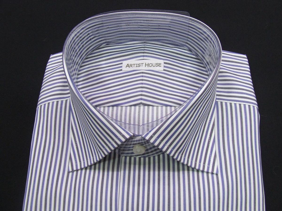 37【Artist House】ウインザーカラー・綿高率混形態安定長袖シャツ・細身体・ホワイト地にネービー縞/襟回り39㎝-裄丈80㎝ 收藏
