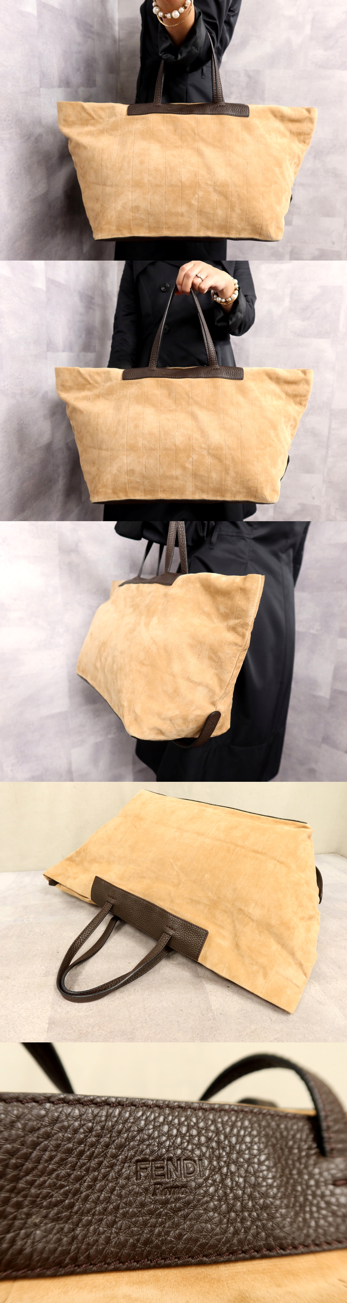 ●美品●FENDI フェンディ●スエード カーフ レザー 本革●トート バッグ●ベージュ ブラウン●ゴールド金具●腕掛け●A4 かばん●Js62304 收藏
