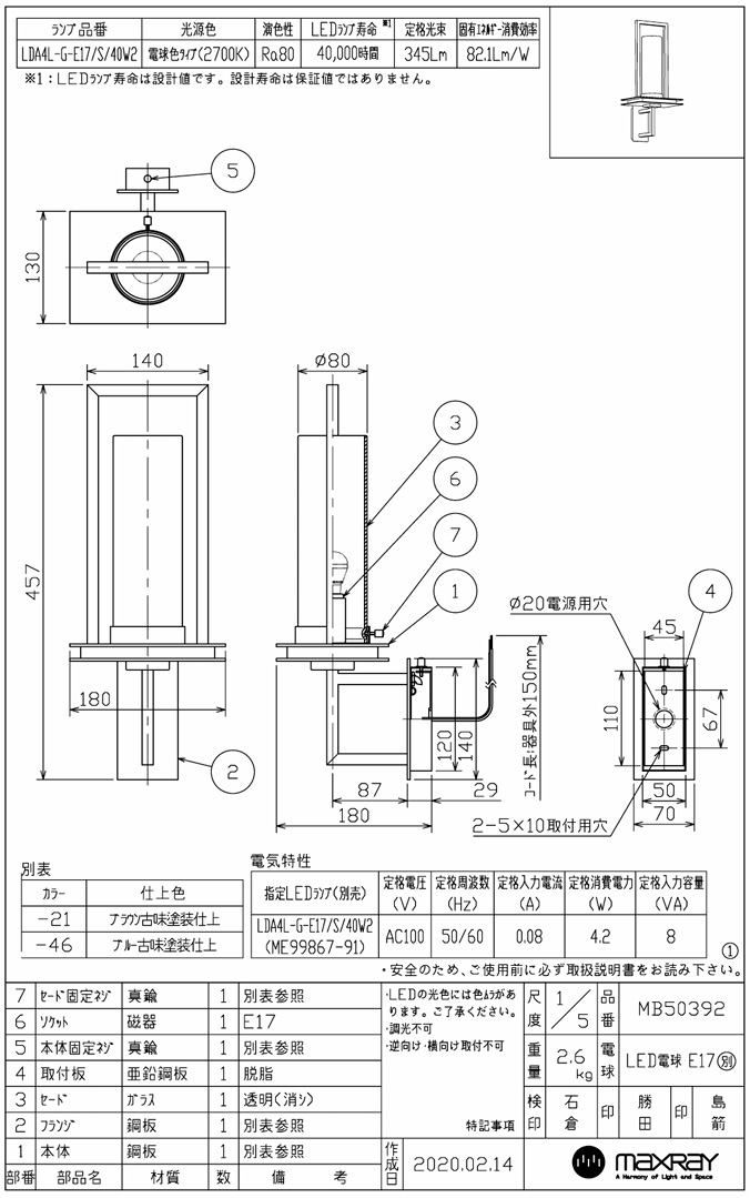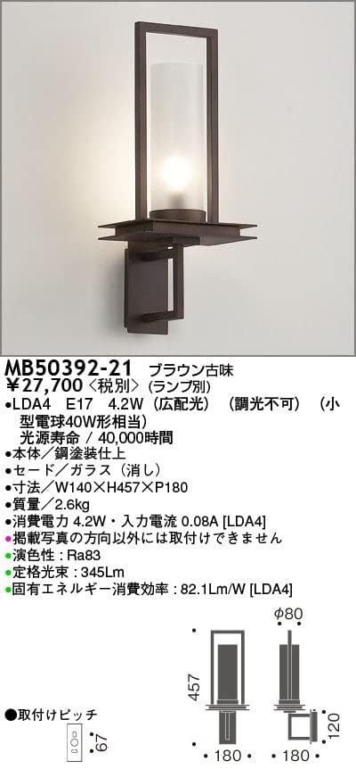 ■メーカー マックスレイ ■品名 LED ブラケットライト ブラウン古味 / MB50392-21 ■サイズ W180 / D180 / H457 / φ80 mm ■製造年 2019年製 ■付属品 ランプ (消耗品のため、保証対象外) ■詳細 ![]() ![]() ※ 取付には、専門家による電気工事が必要です。 「電気工事士」の有資格者にご依頼ください。