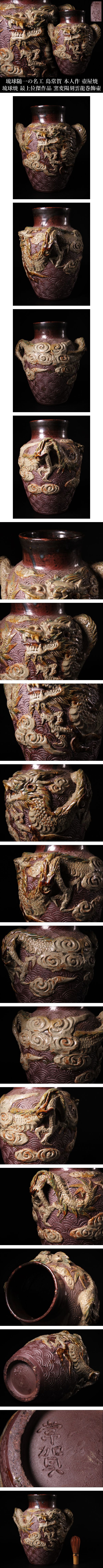 【ONE'S】琉球随一の名工 島常賀 本人作 壺屋焼 琉球焼 最上位傑作品 窯変陽刻雲龍巻飾壷 花瓶 高27cm 古美術品 | |||