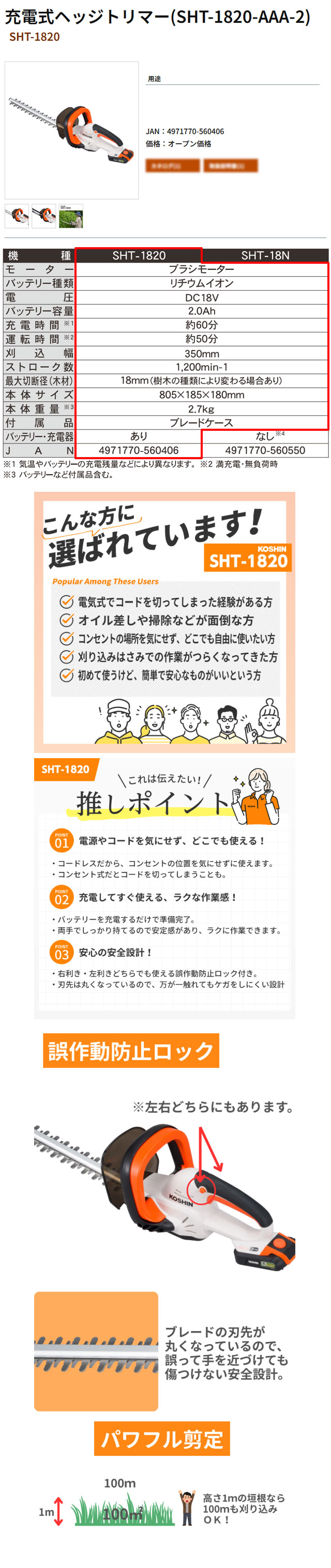誤作動防止ロック ブレードの刃先が丸くなっているので、 誤って手を近づけても傷つけない安全設計。 パワフル剪定 高さ1mの垣根なら 100mも刈り込み OK! ■仕様■