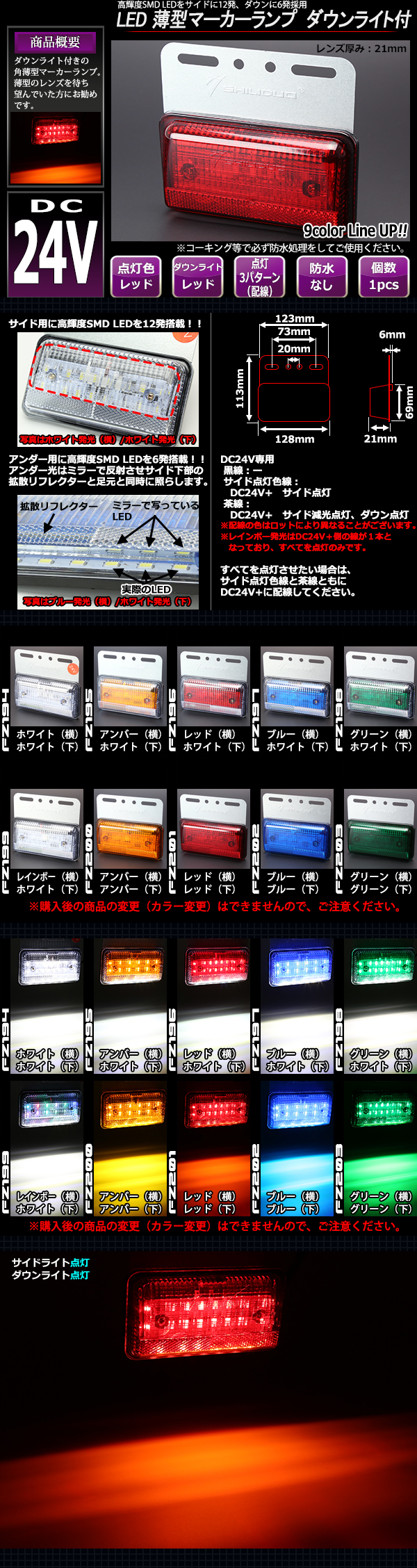 ■商品コード FZ201 ■商品タイトル 24V用 LED薄型マーカーランプ 角型 ダウンライト付き LEDサイド12発+ダウン6発 ■対応電圧 DC24V専用 ■発光色 サイドライトはレッド点灯 ダウンライトはレッド点灯 ■発光モード ・サイドライト点灯 ・サイドライト減光点灯、ダウンライト点灯 ・ダウンライト点灯、サイドライト点灯 ■数量 1個 出品数以上ご必要な方は、必ず落札前に質問欄よりご質問ください。 ※在庫があれば対応は可能ですが、の規約上、ご落札いただいた商品とその個数しかお取引ができませんので別途出品します。そちらよりご落札ください。 お急ぎの方はリンク先の弊社ヤフーショッピング店でも同じ商品を出品しております。 ■特徴 10V?30Vまで対応のワイドボディのマーカーランプ! トラックや自動車や、ボートトレーラーなど幅広くご使用いただけます。 綺麗に発光するインナーチューブを採用 発光にツブツブ感がなくなり上品な光になっております。 基板を樹脂コーディングし、完全防水となっております。 ※短時間の水没は大丈夫ですが、水中では使用できません。 ■注意事項 取り付けネジは付属しません。 ご落札後のレンズカラーや発光色の変更は行えません、商品説明文やタイトルに記載しているレンズカラーと発光色をお間違えがないようにお願いします。 |