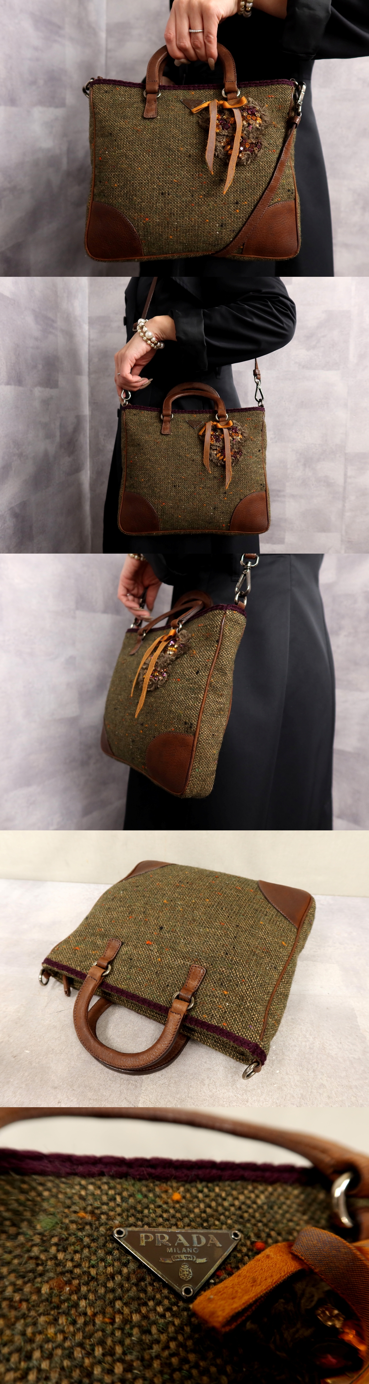 超美品●PRADA プラダ●三角ロゴプレート●ツイード カーフ レザー 本革●2way ハンド バッグ●ブラウン グリーン系●イタリア製●Js63443 收藏