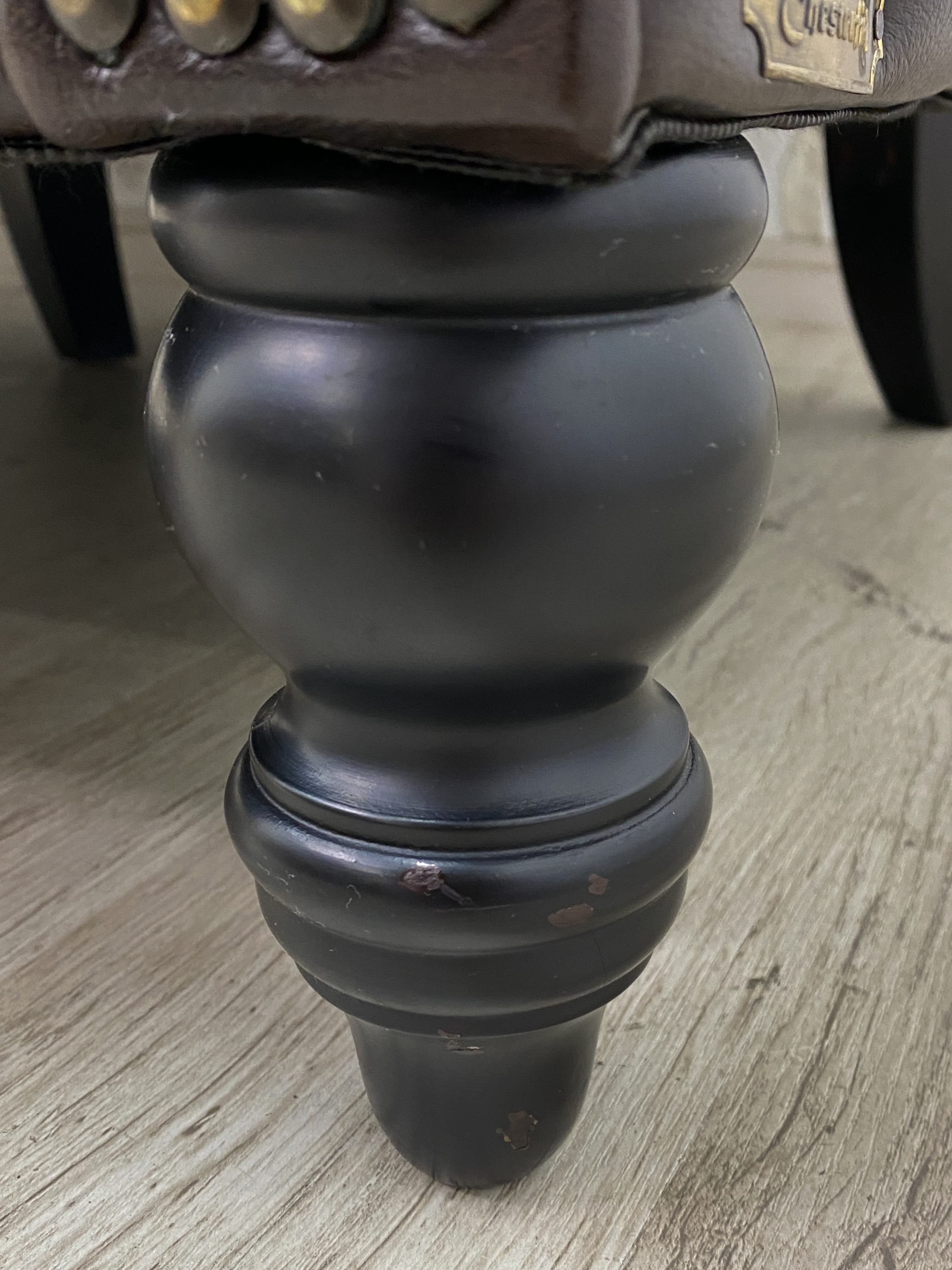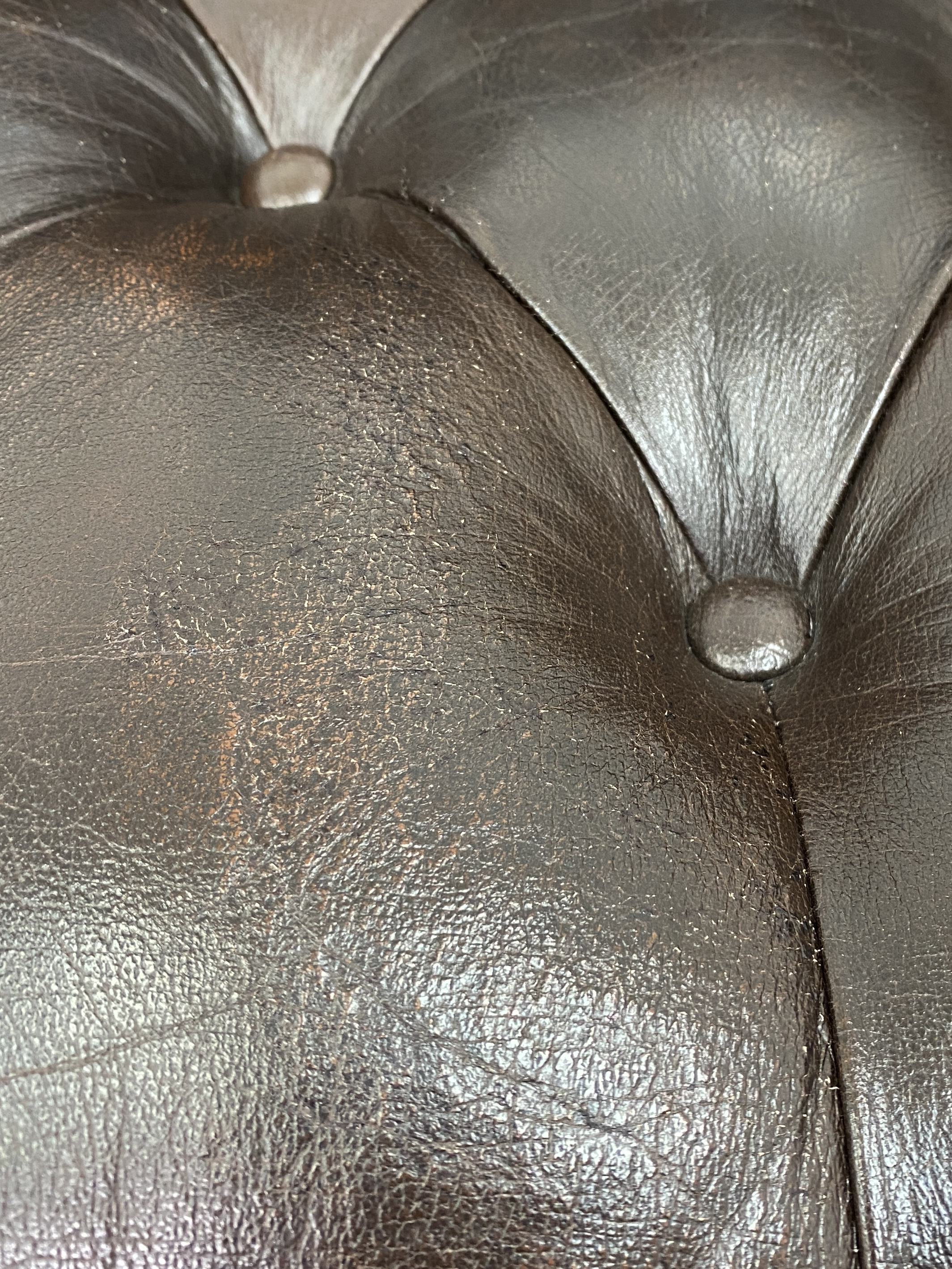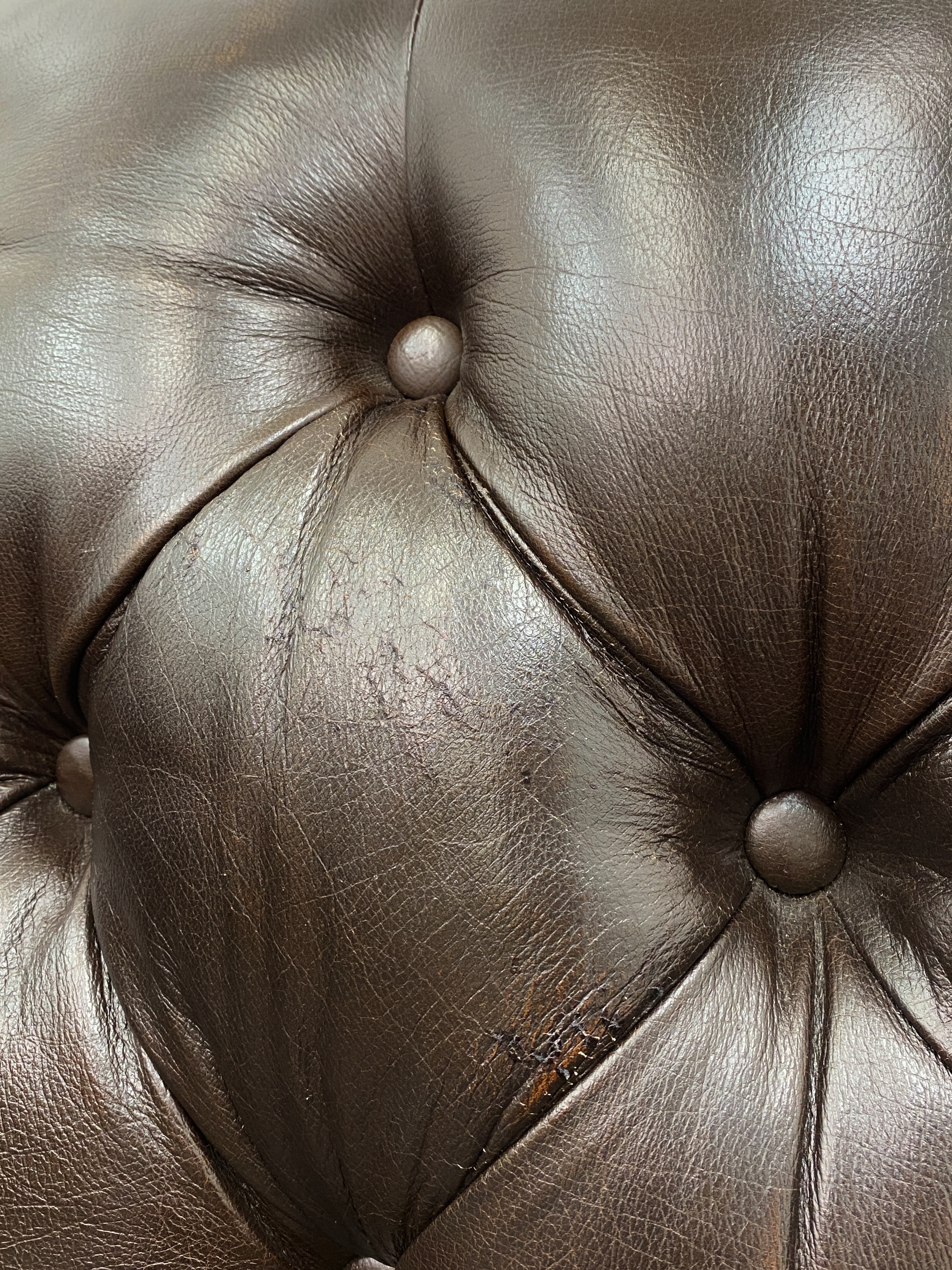 こちらはA&A Chesterfield社 チェスターフィールド ソファです。 中古品です。 【A&A Chesterfield社】 英国伝統のアンティークスタイルを忠実に再現した 贅沢な総本革張りのチェスターフィールド専門メーカーとして知られています。 A&A Chesterfield社による、本革張りチェスターフィールドソファのご紹介です。 英国伝統のソファとして知られるチェスターフィールドのデザインで、伝統的な英国の職人技を用いて制作された逸品です。 革表面のボタン留めや、縁を囲んだ鋲打ちなど熟練職人のハンドメイドによって制作されています。 張り生地は黒に近いダークブラウン色で、ムラ染めによってアンティーク特有の雰囲気を醸し出しています。 程よく固さのある座面は長時間座っても疲れにくく、寛ぎの時間を過ごすのに最適です。 上質なレザーを使用した、使い込むほどに深い味わいと風格が出てくる格調高いソファです。 【コンディションについて】 革の表面に割れや小さな剥がれがありますが、張りや艶もあり全体の印象としては良好です。 背面に1箇所キズがありますが、設置角度によっては目立ちにくい場所です。 当店では皮革用クリームにてメンテナンスしています。脚部には所々小さなキズが見られます。 職人による信頼できる作りで、何世代にも渡りご愛用いただける家具となっています。 他詳細については下記画像も併せてご参照ください。