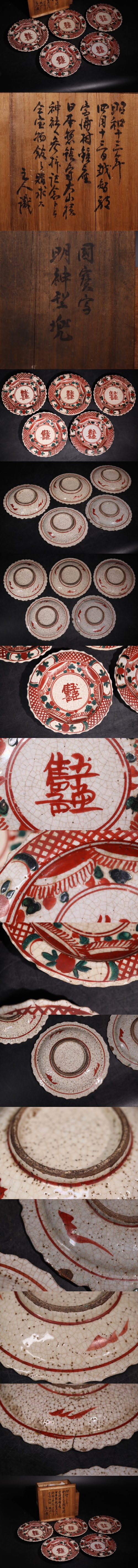 | 時代 赤絵 草花 ・ 漢文 皿 五客 合箱 / 中国美術 色絵 茶器 煎茶道具 検索: 萬暦赤絵 南京赤絵 .G3406 |