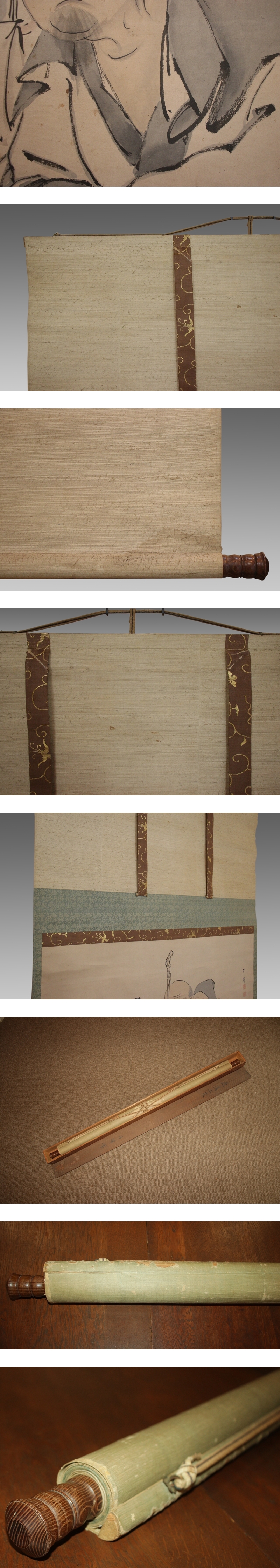 月僊 げっせん(1741-1809) 江戸中期の画僧。尾張の人。名は玄瑞。 京都知恩院に住み、円山応挙や与謝蕪村の影響を受け、山水・人物画に優れた。 晩年、私財を投じて伊勢山田に寂照寺を再興。 本紙は、染み、汚れ、強い折れ、皺、擦れ、生地剥れがあります。 表装は、染み、汚れ、折れ、皺、虫食い、破れ、ほつれ、剥れ、修理痕があります。 【サイズ】 作品 横約115cm×縦約59cm 表装 横約121cm×縦約167cm |