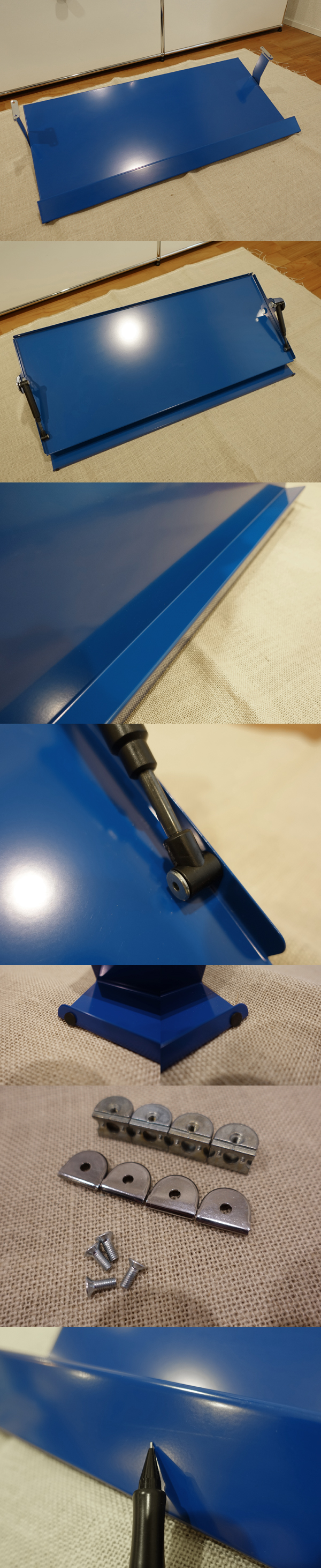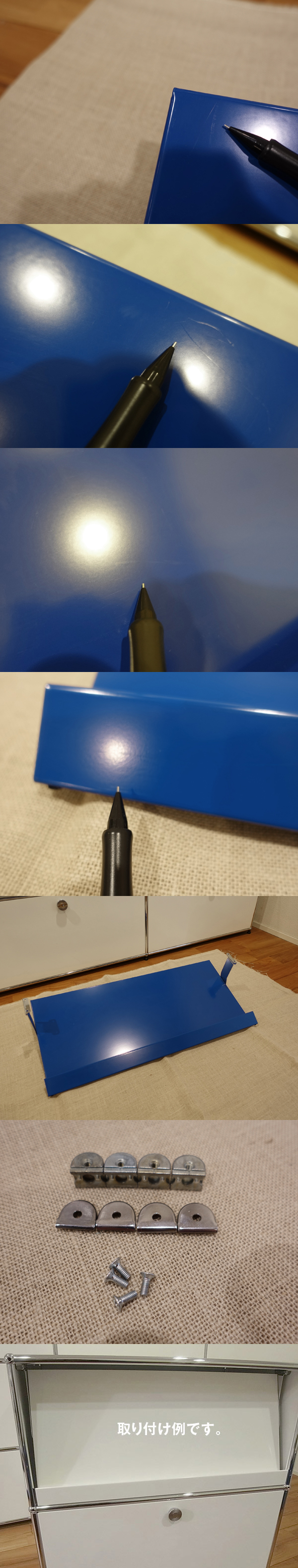 ご覧いただきましてありがとうございます。 USMハラーシステム用の純正部品「アングルシェルフ」です。 本、雑誌やパンフレットなどをユニット前面にディスプレイするための部品です。 画像内に、取り付け後を写した画像がございますが、部品単体での出品です。 サイズは75×35cmモジュールで、カラーは「ジェンシャンブルー」です。 固定金具付きです。 製造年代ごとに少しずつ仕様の異なる製品ですが、おそらく現行最新モデルかと思います。 複数在庫がございますが、1枚単位での出品です。 必要数量をご入力の上、お求めください。 数量1=1枚、数量2=2枚 となります。 ヤフーのシステムの仕様上、数量2以上でお求めの場合、ご落札後の送料が正確に表示されません。ご購入の手続きを行っていただいた後に、当ストアにて金額を調整いたします。 数量1の場合も2の場合も、ゆうパック140サイズでのお届けになります。 他商品との同梱をご希望の場合は、質問欄より発送サイズをお問い合わせください。 コンディションですが、中古の状態で入手をしたものですが、特に目立つ大きなキズもなく良好です。 光をかざすと反射して見える程度のキズやごく間近で見るとわかるようなキズがございますが、ご使用時に気になるような大きなダメージはございません。 パネル表面の光沢も十分に残っており、全体的にきれいな印象です。 画像は代表的なキズを写したもので、転用しておりますので、画像=お届けする個体とはなりませんことご了承ください。 表面塗装の強いハラーですが、商品の性質上、細かなスリキズは避けられないものです。目についたスリキズなどはできる限り写真に掲載しましたが、その他気にならない程度の小キズはございますので、あらかじめご了承ください。 取り付けのサポートはいたしません。また、お持ちのユニットに取り付ける際、破損や不具合等が生じてもいっさいの責任は負いません。ご自身の責任においてご使用ください。 |