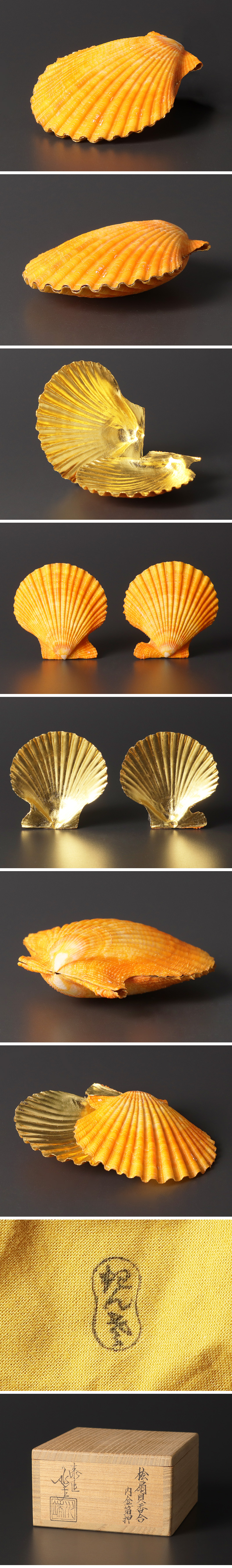 淡い橙を帯びた貝のやわらかな色に、内側の金箔がほのかに光を返し、自然の美しさと手仕事の冴えが調和した香合です。 ★商品は六代川端近左の作品である事を保証致します。 |
