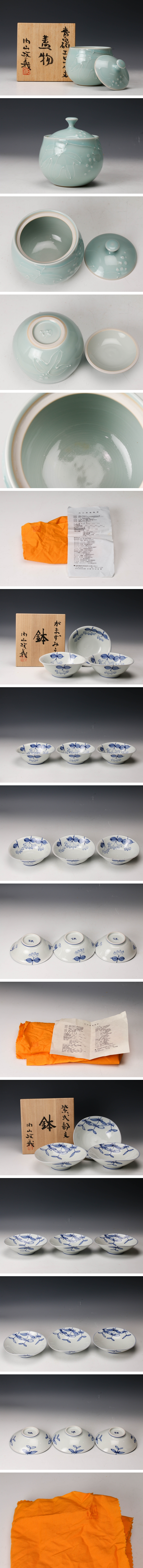 【佳香】内山政義 紫式部文鉢三客 がまずみ文鉢三客 青白磁エビヅル文蓋物 三点セット 共箱 本物保証 收藏