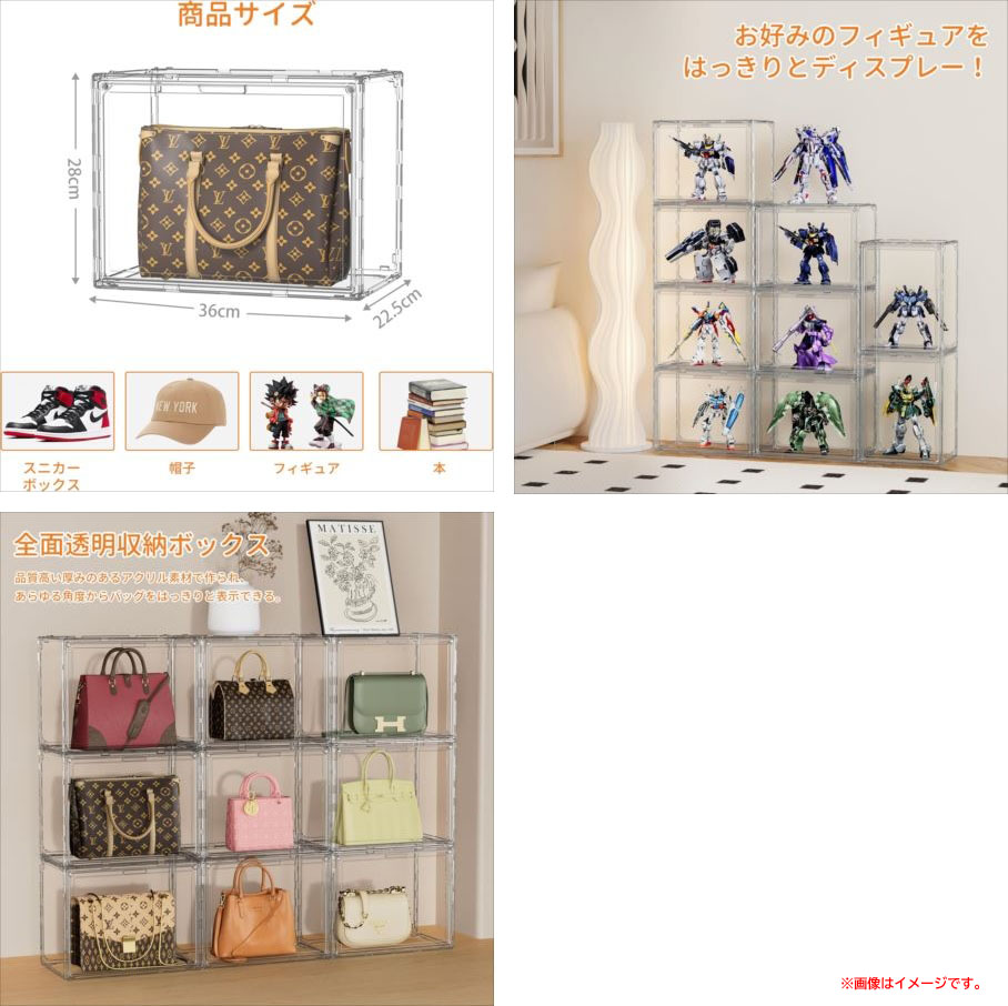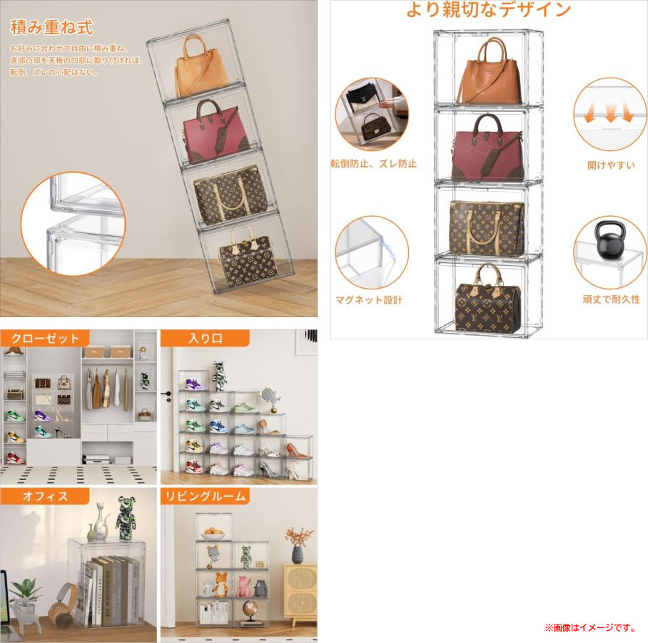【商品特長】 ◆収納ケースは透明度が高く厚みのあるアクリル素材で作られ、お気に入りのコレクションを どの角度からもくっきりと美しく展示できます。フィギュアをはじめ、カバン、帽子、スニーカー、 洋服、化粧品、小物入れなど、さまざまなアイテムの陳列棚としてお使いいただけます。 ◆各ケースには専用の接続機構が設けられており、底面の突起を天面のくぼみにしっかりとはめ込むだけで、 転倒やずれを防ぎ、安定した積み重ねが可能です。収納ボックスは縦置き・横置きのどちらでも対応。 お好みに合わせて自由にレイアウトできます。オフィスやリビングはもちろん、クローゼットや狭い玄関、 ベッド下など、あらゆる空間のすき間を有効活用できるため、大幅な省スペースを実現します。 ◆マグネットドアが装備されており、ショーケースの開閉が簡単です。透明アクリル製なので中身が一目で把握でき、 お目当てのバッグや靴を素早く見つけられ、時間の節約になります。改良された磁石により強力な吸引力を実現。 ドアが自然に開く心配がなく、高い気密性でホコリや湿気から収納物を守ります。 バッグや靴、フィギュアの劣化や虫の侵入を防ぎ、大切なコレクションを良好な状態に保ちます。 ◆クリアボックスは分厚いアクリル素材を使用しているため、市販の多くのクリアボックスより硬く、より頑丈で安定しています。 十分な耐荷重性を備えています。フィギュア、バッグ、スニーカーを愛好する方の必須アイテムです。 アクリルケースの組み立ては驚くほど簡単で、工具は必要なく、女性でもたった数分で完成させることができます。 | |||||||||||||||
