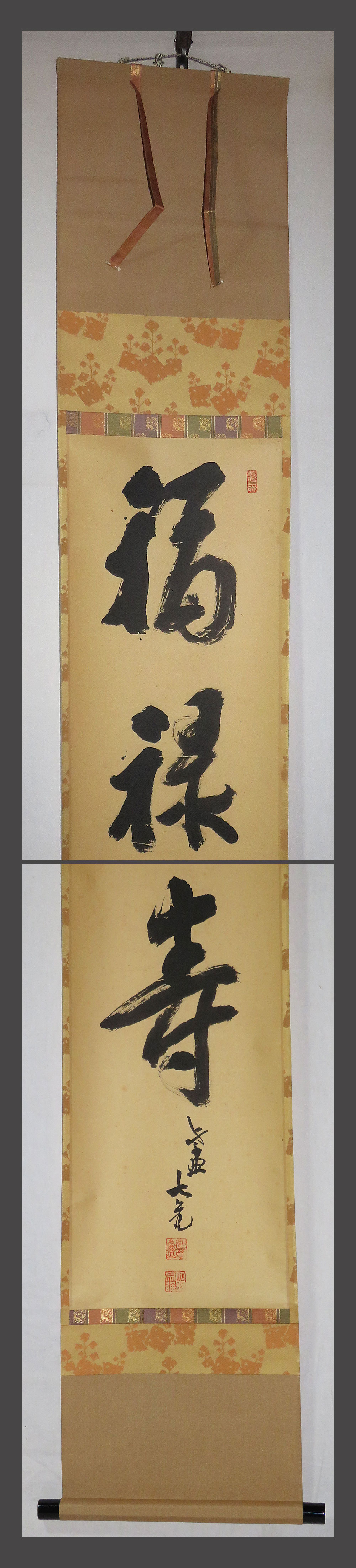 肉筆、真作保証。 作品に、時代感、多数のシミ、汚れ、折れ、巻きじわがあります。 表装に、時代感、ヨレ、折れ、巻きじわがあります。 表装裏側に、経年による多数のシミ、汚れがあります。 箱は共箱です。軸先があります。下部に書の読みが有ります。 大徳寺/立花大亀 略歴:臨済宗の僧。大徳寺塔頭徳禅寺長老。明治31年(1898)~平成17年(2005)。 大阪府堺市生まれ。(1921)南宗寺で得度し、妙心寺専門道場で修行。 大徳寺511世。大徳寺別院徳禅寺住職などを経て大徳寺宗務総長に就任。 大徳寺派管長代務者。昭和57年(1982)から昭和61年(1986)まで花園大学学長。 大徳寺最高顧問。如意庵庵主。平成17年(2005)8月25日遷化。 【福禄寿】 名前は幸福の福、身分を表す禄、寿命を表す寿の三文字からなり、 中国、道教の長寿神。 南極老人星の化身であり中国の村や町に住み、 人々の信仰を集めたといわれる仙人である。 下記の真作保証について・注意事項をよくご覧の上、 お気に召された方に、お譲り致しますので、ご入札を宜しくお願い致します。 |