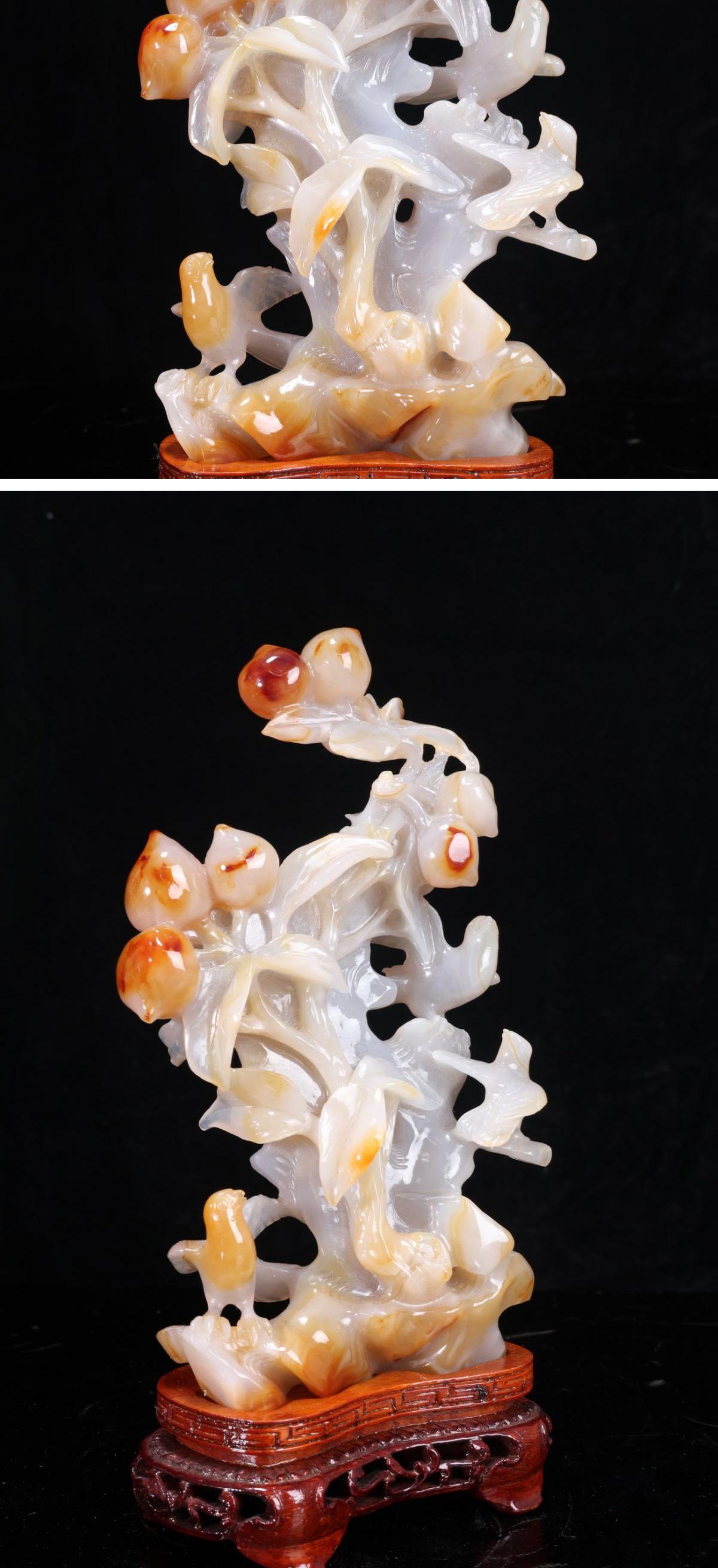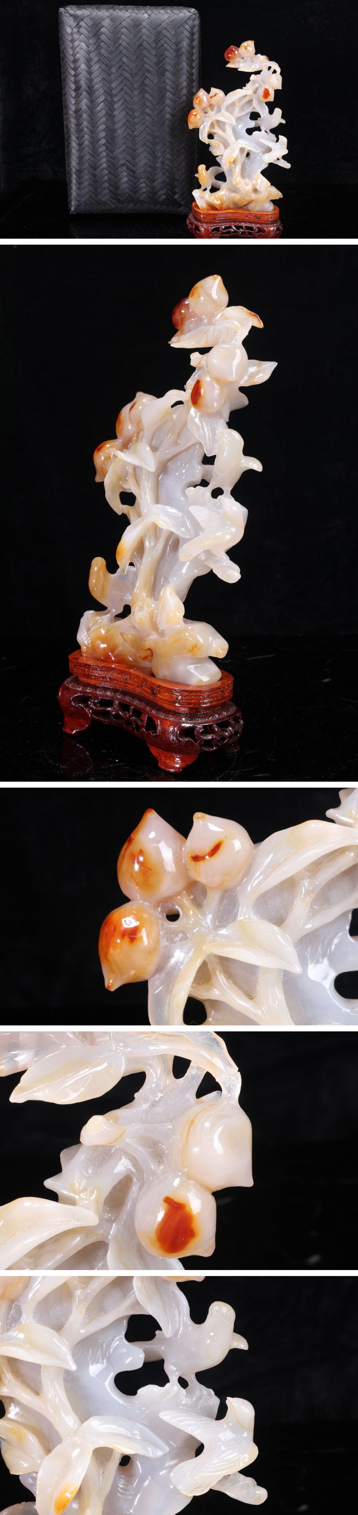 【珍品堂】1円から V21-V11 瑪瑙 メノウ 天然物 台付 もも コウモリ 彫刻 置物 重428g 高18cm 中国 古美術 東洋彫刻 骨董品 置物 時代物 收藏