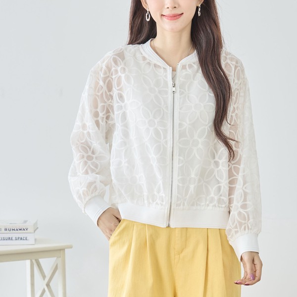 透ける花柄が、春風を誘う。大人のシースルージップブルゾン。