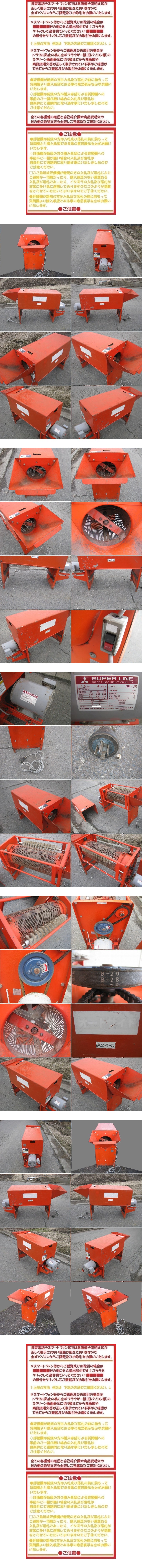 ◆◆ご注意!!◆入札及び落札する前に必読ください!◆◆◆◆◆◆◆◆◆◆◆◆◆◆◆◆◆◆◆◆◆◆◆◆◆◆◆◆◆◆◆◆◆◆◆◆◆◆◆◆◆◆◆ ◇ここ最近多くなっておりますが日本語が分からない方や連絡がとれなくなったりお取引がスムーズにできない方や外国人とのお取引はご遠慮させていただきます。 ◇評価欄が新規の方は入札前に質問欄より購入希望である事を必ずご一報願います。 ◇評価欄が新規の方の購入希望による事前のご一報が無い場合の入札及び落札は無条件にて強制的に取り消す事にいたしましたのでご注意ください。 ◇また、当方の個人的な判断で評価が悪い方も入札等の取り消しの対象となる場合もあります。 ◇尚、当方の個人的な判断にて悪質と判断した場合はヤフーJAPANへ報告する場合もありますのでご承知ください! ▽入札の際はよくご考慮&内容文を必読の上、ご入札ください。誤って入札及び落札してもキャンセルは一切お受けできません!! ▽いかなる場合でも入札中及び落札後の入札者様&落札者様の都合によるキャンセルは一切お受けいたしませんのでご承知ください。 ▽携帯電話やスマートフォン等でのお取引やご観覧等はトラブル防止の為にお取引できません。パソコンからのお取引又はご観覧ください! ▽当方の都合上、土曜日&日曜日&祝日&各大型連休中の発送依頼及び発送はできません。平日(月曜日~金曜日)のみの発送依頼及び発送となります。 ▽落札後の連絡方法は取引ナビのみでのやりとりとなり電話等の連絡方法でのやりとりは一切いたしませんのでご了承ください。 ▽質問欄には個人情報等の名前や電話番号の記載はお断りいたします。また、この電話番号やメールアドレスへご連絡ください等もお断りいたします。 ●発送時は送料着払いのみの発送依頼となっておりますので送料元払いや代金引換えや直接引き渡し時の現地お支払い等は一切お断りいたします。 ●直接引取りに来られる場合でも入金先払いのみとお取引となり直接引き渡し時の現地お支払い等は一切お断りいたします。 ●直接引取りに来られる場合は画像の状態のままの引き渡しとなりますのでパレット及び梱包及び荷造り等は一切いたしませんのでご注意いただければと思います。 ●直接引取りに来られる場合は落札後は1ヵ月以内に引き取りに来られる方のみとさせていただきますのであらかじめご了承ください。 ●直接引取りに来られる方は落札後1ヵ月以内に引き取りに来られない場合は1ヵ月を過ぎた場合に翌日から1日経過するたびに1日1000円を別途ペナルティーとして1日ごとに徴収いたします。 ●当方多忙により急用及び出張等の不在の場合が多々ありますので引き渡しの際にはスケジュール調整が必要になりますのでご了承ください。 ★2018年3月1日よりルール改定によりヤフー簡単決済のみのお取引となりましたのであらかじめご了承ください。 ※落札後はヤフー簡単決済にて決済期限以内に必ずご入金&お支払いいただける方のみご入札及び落札をお願いいたします。 ※ヤフー簡単決済にて決済期限以内にご入金&お支払いいただけない場合は落札者様都合によるキャンセル扱いとなり評価欄にマイナス評価がつきます。 ★落札品を発送希望の方にて西濃運輸を利用希望の場合は個人及び会社及び法人等でも完全なる営業所止めのみとなりましたのであらかじめご了承ください。 ◆◆◆◆◆◆◆◆◆◆◆◆◆◆◆◆◆◆◆◆◆◆◆◆◆◆◆◆◆◆◆◆◆◆◆◆◆◆◆◆◆◆◆◆◆◆◆◆◆◆◆◆◆◆◆◆◆◆◆◆◆◆◆◆◆◆◆◆ @@@@@@@@@@@@@@@@@@@@@@@@@@@@@@@@@@@@@@@@@@@@@@@@@@@@@@@@@@@@@@@@@@@@@@@@@@@@@@@@@@@@@ ◆お知らせ◆ ※必ず必読願います!! ●天災等の影響による発送や配達のお荷物の遅延や見合せが発生しております。 ●西濃運輸のホームページよりご確認ください。 ▼西濃運輸→■■■■■西濃運輸のホームページ■■■■■ ※その他の地域におきましても、天候や道路状況により遅延が発生することがございます。発送につきましては遅延が発生しておりますので必ずご確認ください。 ●西濃運輸のホームページより必ずご確認ください。 @@@@@@@@@@@@@@@@@@@@@@@@@@@@@@@@@@@@@@@@@@@@@@@@@@@@@@@@@@@@@@@@@@@@@@@@@@@@@@@@@@@@@ ■■■■■その他にも大量出品中です!!こちらもクリックして是非見ていってください!!■■■■■ ●オートサイド メーカー不明 AS-7-5 200V の出品です。 ■本体外寸 奥行き 約1550㎜ × 横幅 約470㎜ × 高さ 約840㎜ (※画像1の状態にて) ■スケルにて計測していますので絶対値ではありません。 (足周り&モーター&各部各所の最大張り出し部分を含んでおります。) ●離農された旧農家さんの方から譲られました。 ★地元では珍しい機種となります。 ●完全に売切ります!! ★値引き交渉等は一切考えておりませんのであらかじめ前もってご一報いたします。 ●前所有者さんの方が離農に伴い使用する機会がなくなった為に譲られたものとなります。 ■キズ&サビ&汚れ&使用感等があります。 ■200V