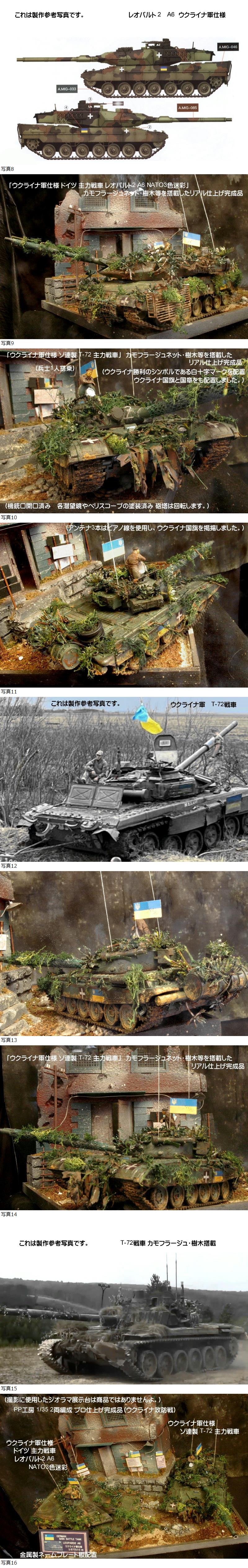 PP工房 1/35 2両編成プロ仕上げ完成品【 ウクライナ軍仕様[ドイツ製「レオパルト2 A6」カモフラージュ樹木][ソ連製 T-72 戦車]】戦車兵2人 收藏
