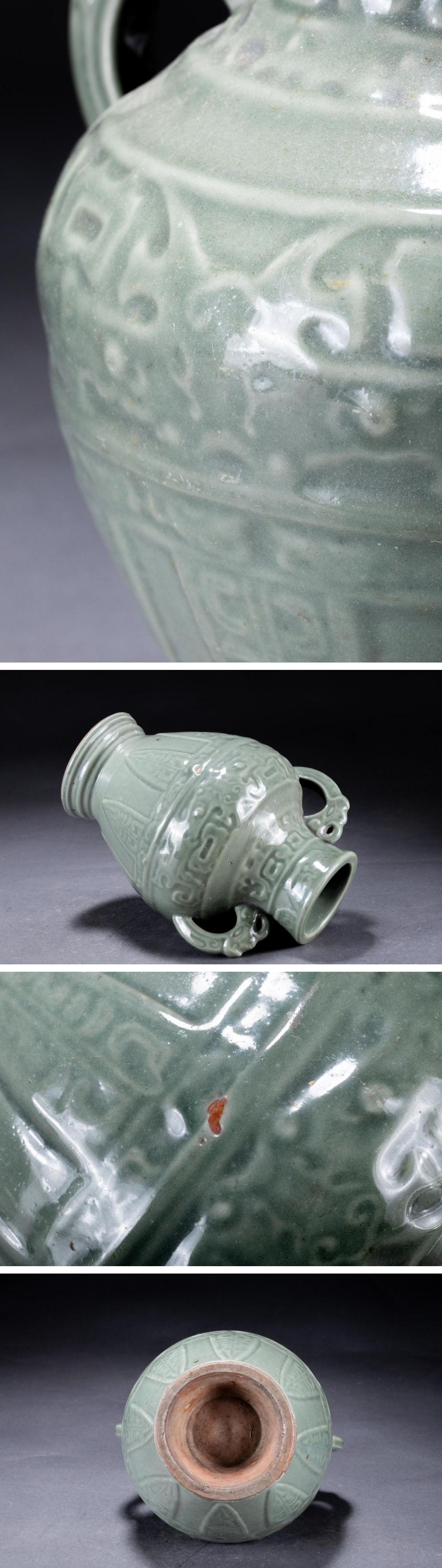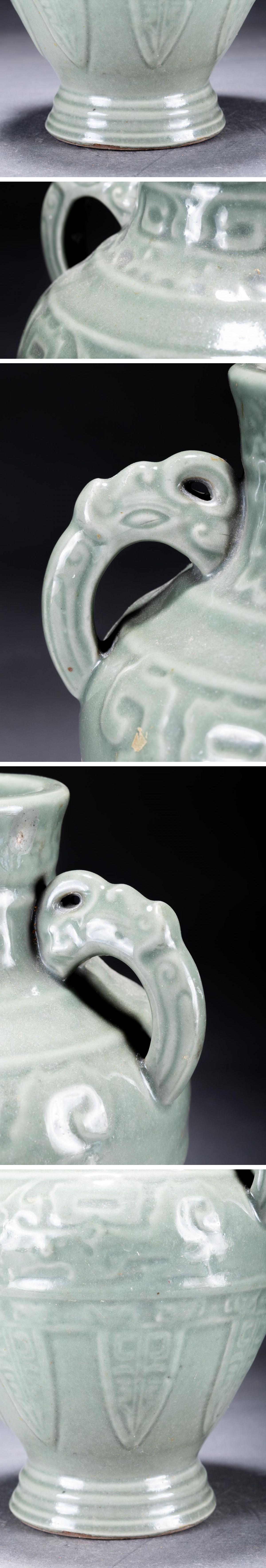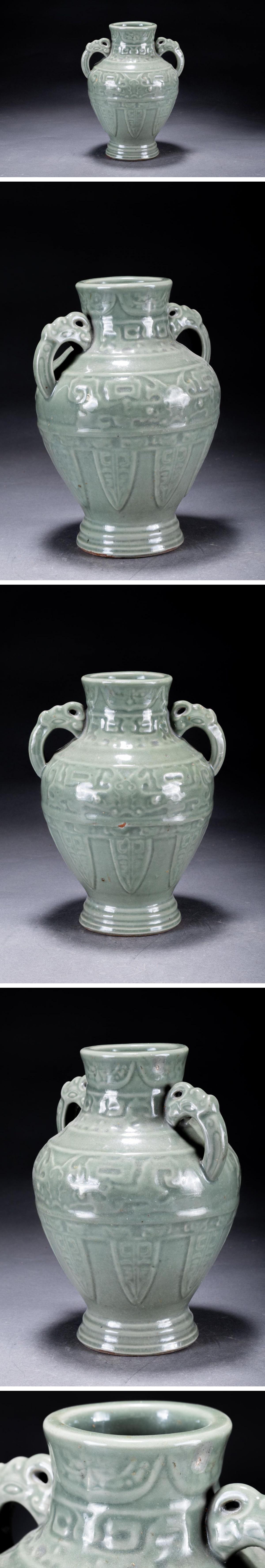 【華】某収集家放出品 明時代 中国伝来 龍泉窯 獣面紋刻入 双龍文花瓶 古美術 骨董品A25090387-QV 收藏