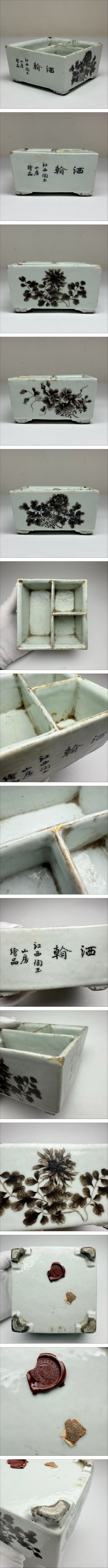 XMF-中国古美術 時代物 色絵 墨彩 筆洗 文房具 書道具 花草図 在銘 江西陶玉山房絵品 唐物 陶磁器 中国古玩 骨董品 古董 傷あり 收藏