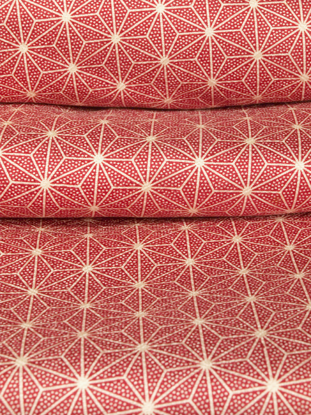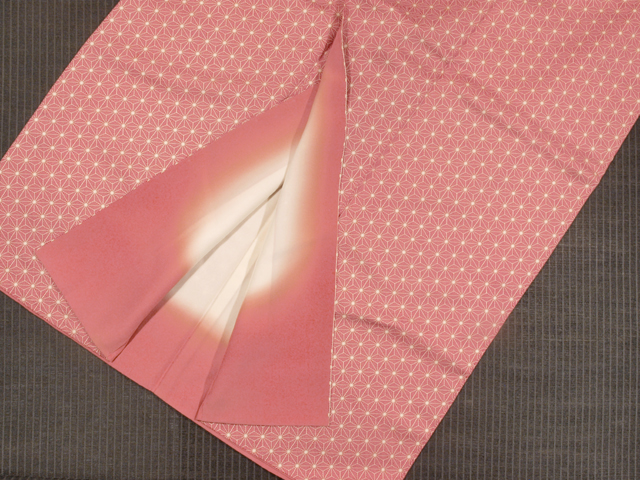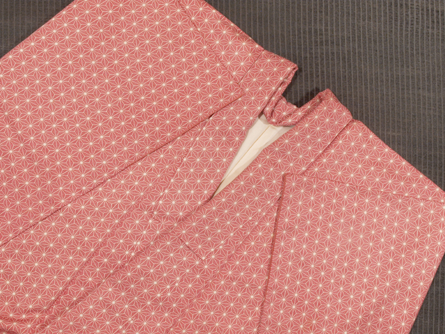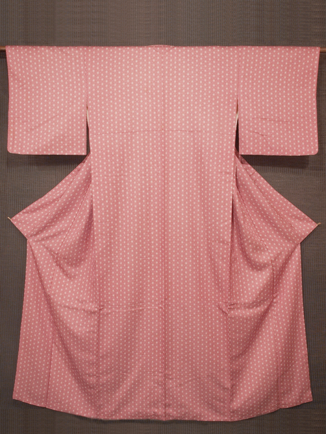 全体的な印象としては沈んだ赤紅色の地に、抽象的な地紋が織り出され、鮫調の地紋と麻葉の文様が染め抜かれた小紋です。袷仕立てです。 シンプルですが帯映えがする意匠です。光沢のあまりない、やわらかな手ざわりの綸子地です。 ユーズド品で、胴裏がうっすらと黄変気味なほか、左後身ごろの腰の背縫い直近に直径約 2cm のごくうっすらとした黄変が 1 か所ありますが、ほとんど判別はつかず、ご着用時には隠れます。文様の白色地部分も全体的にわずかに黄変気味なのかもしれませんが、判別はつかず、そのほかに目につくしみやよごれ、褪色などのダメージはなく、全体的にはきれいな状態なので、気にされない方であればご着用は可能です。 |